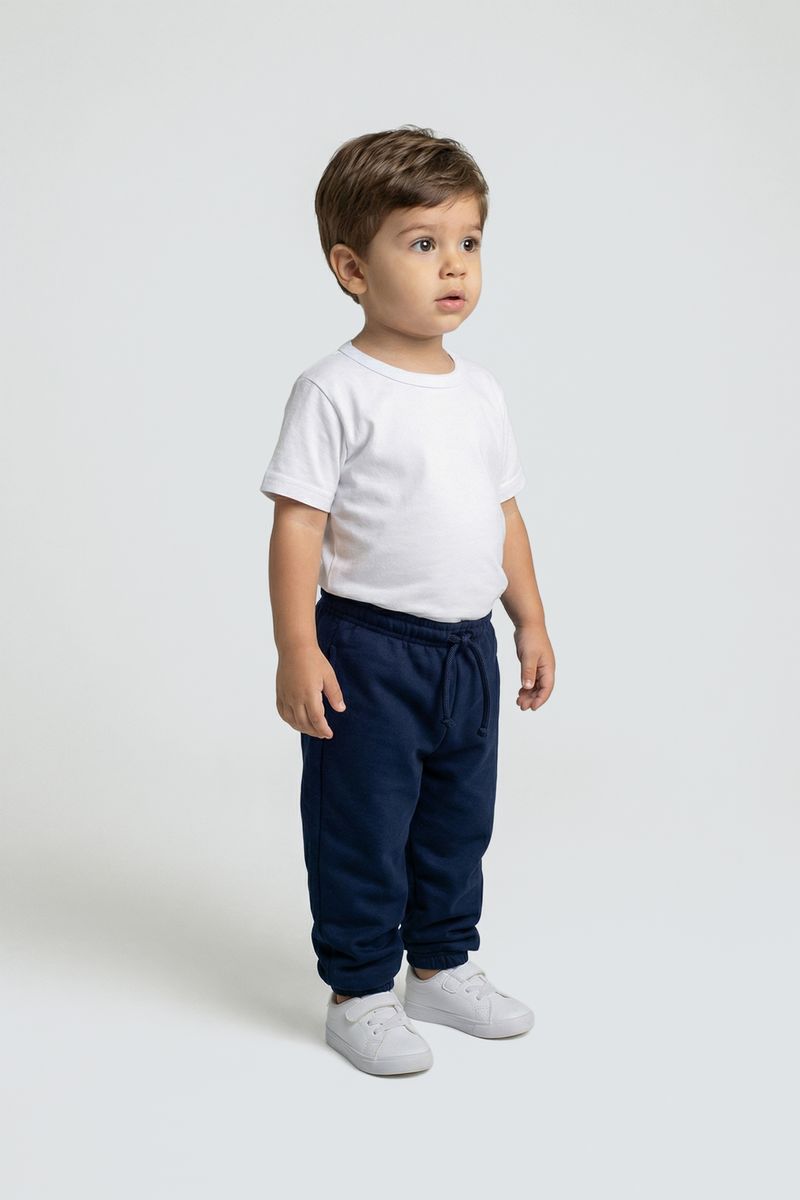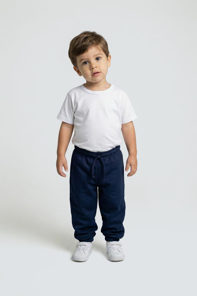 Combine esta calça azul marinho com camisetas brancas ou coloridas para um visual casual. Para um toque mais despojado, adicione um tênis branco de velcro. Em dias mais frescos, uma jaqueta leve complementa o look, criando um conjunto versátil e cheio de estilo para os pequenos.