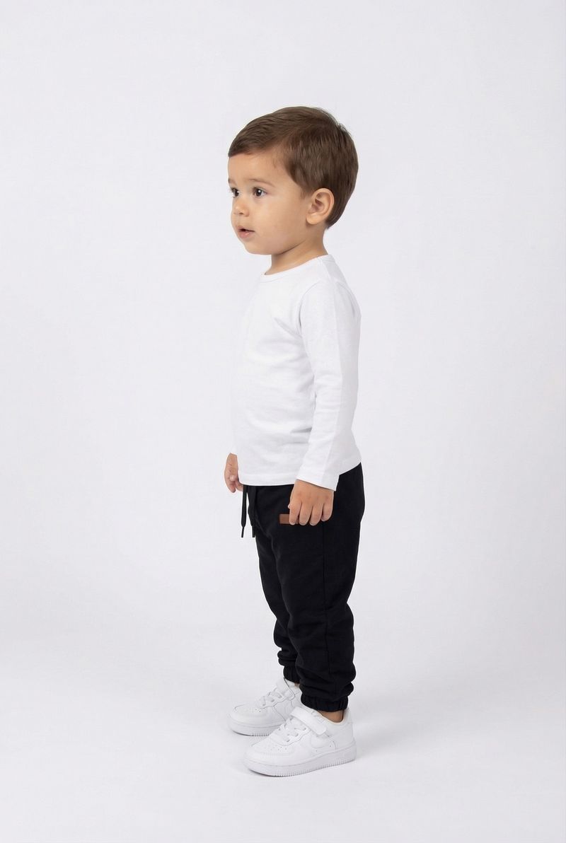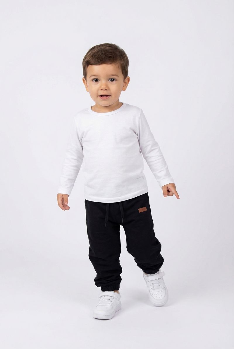 Combine a calça jogger com uma blusa de manga longa branca para um visual clássico e confortável. Para um toque mais despojado, adicione tênis brancos de velcro. Uma jaqueta leve pode complementar o look em dias mais frescos, criando um conjunto estiloso e prático.