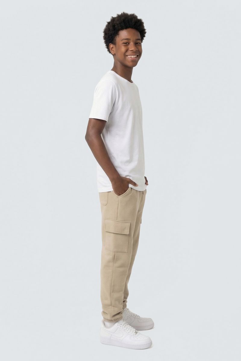 A Calça Cargo Jogger Juvenil da Caedu redefine o estilo com seu design moderno e o conforto do moletom com felpa. Na cor bege, um tom terroso super em alta na moda, ela possui bolsos cargo laterais, cós com cordão e punhos elásticos, garantindo um visual despojado e prático para o dia a dia.