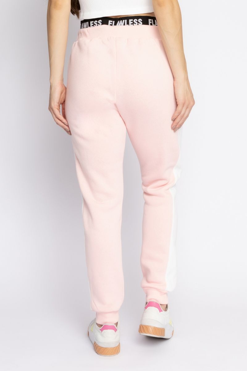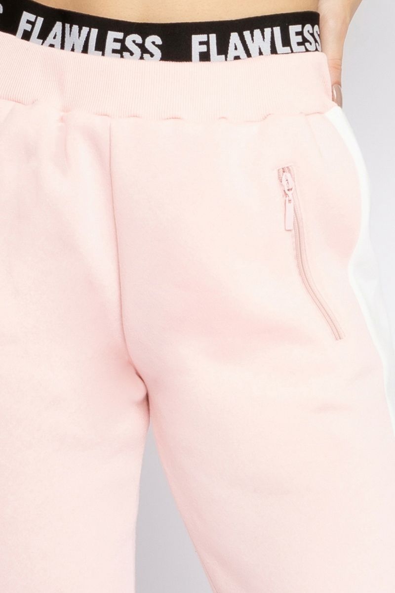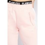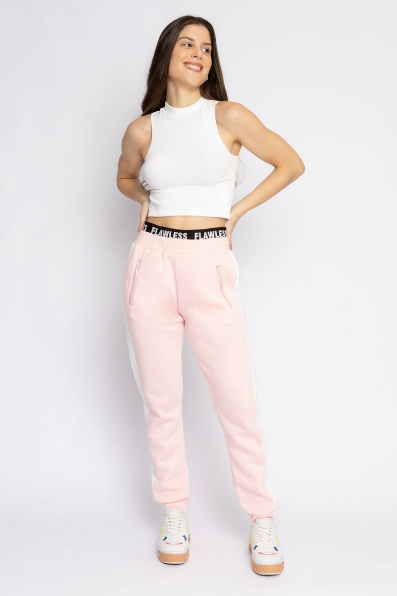 Calça Jogger rosa clarocom cintura média e elástico preto sobreposto com lettering flawless, bolsos com zíper, elástico no cós e na barra. O modelo solto, confeccionado em moletom, traz ao look muito conforto, sem deixar de lado o estilo da peça.