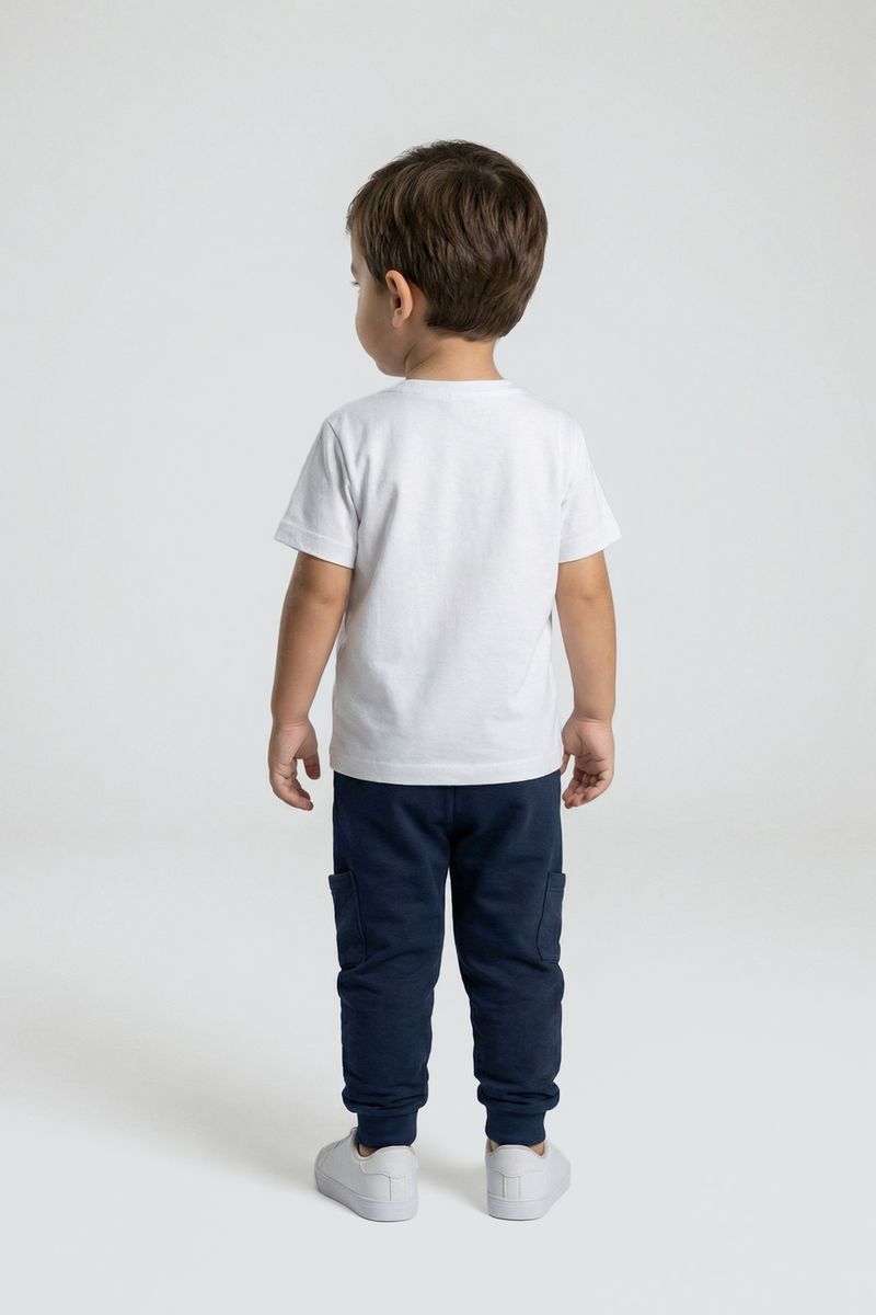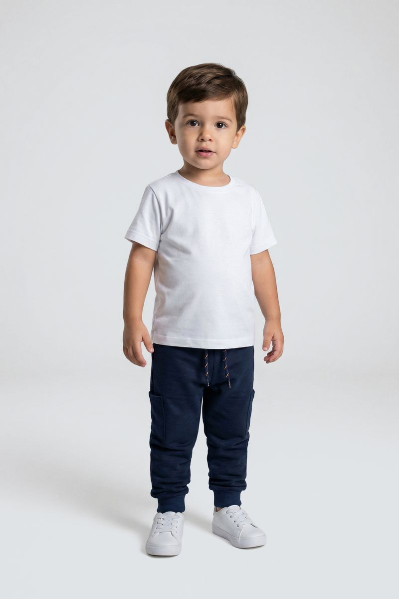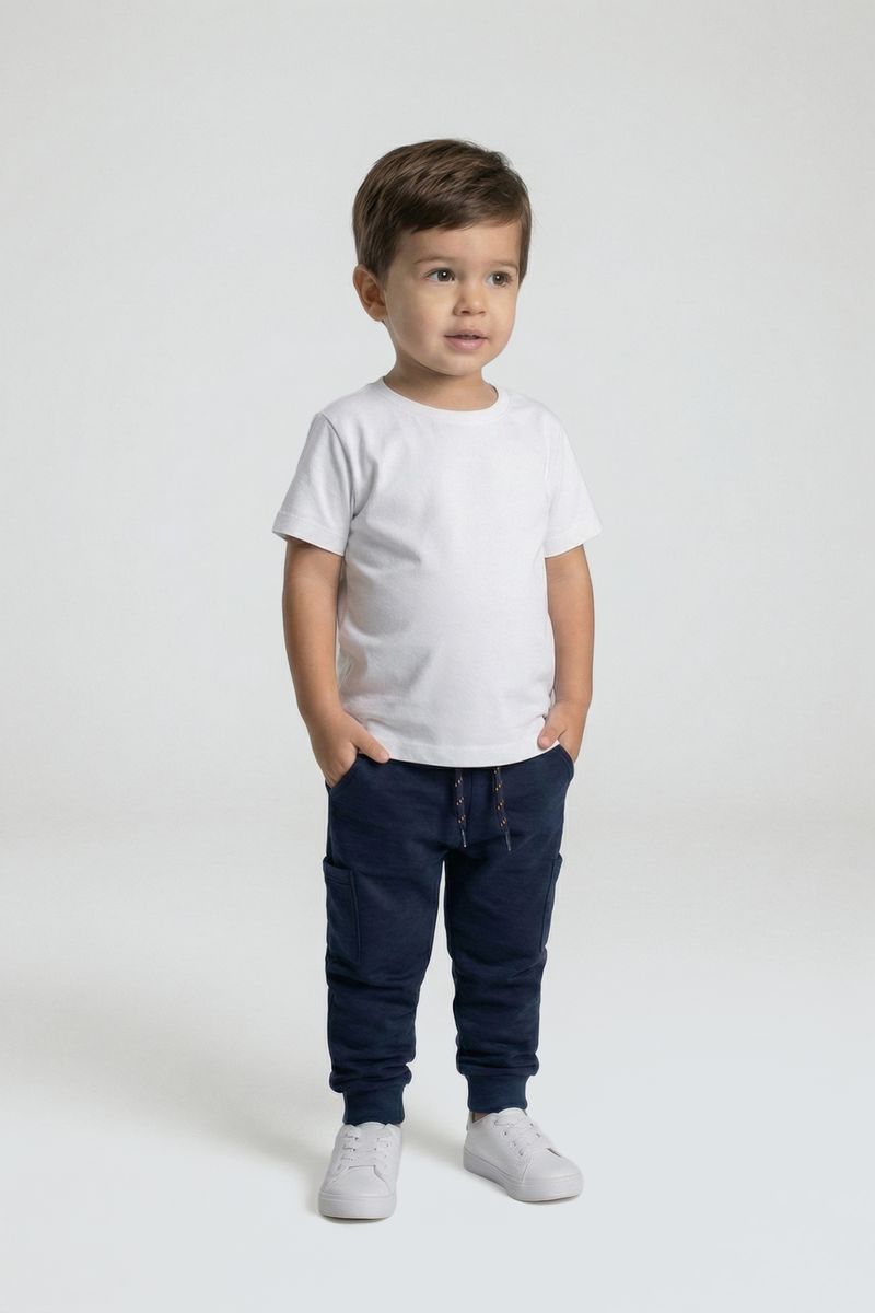 Combine esta calça jogger azul escura com camisetas básicas brancas ou coloridas para um visual descontraído. Para dias mais frescos, adicione uma blusa de manga longa ou um moletom com capuz. Complete o look com tênis casuais brancos ou coloridos, criando um estilo moderno e confortável para o seu pequeno.