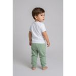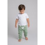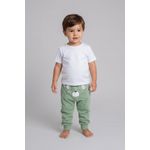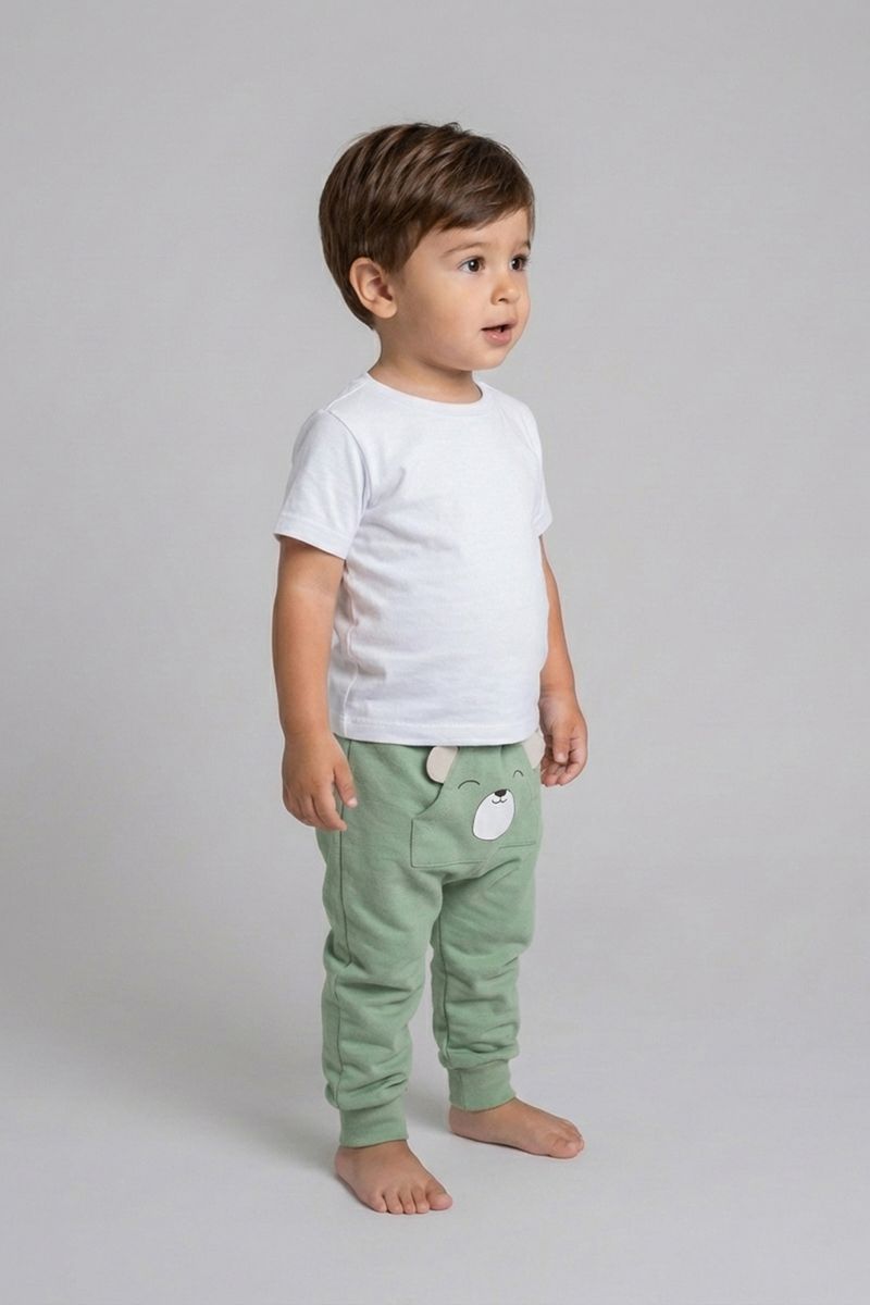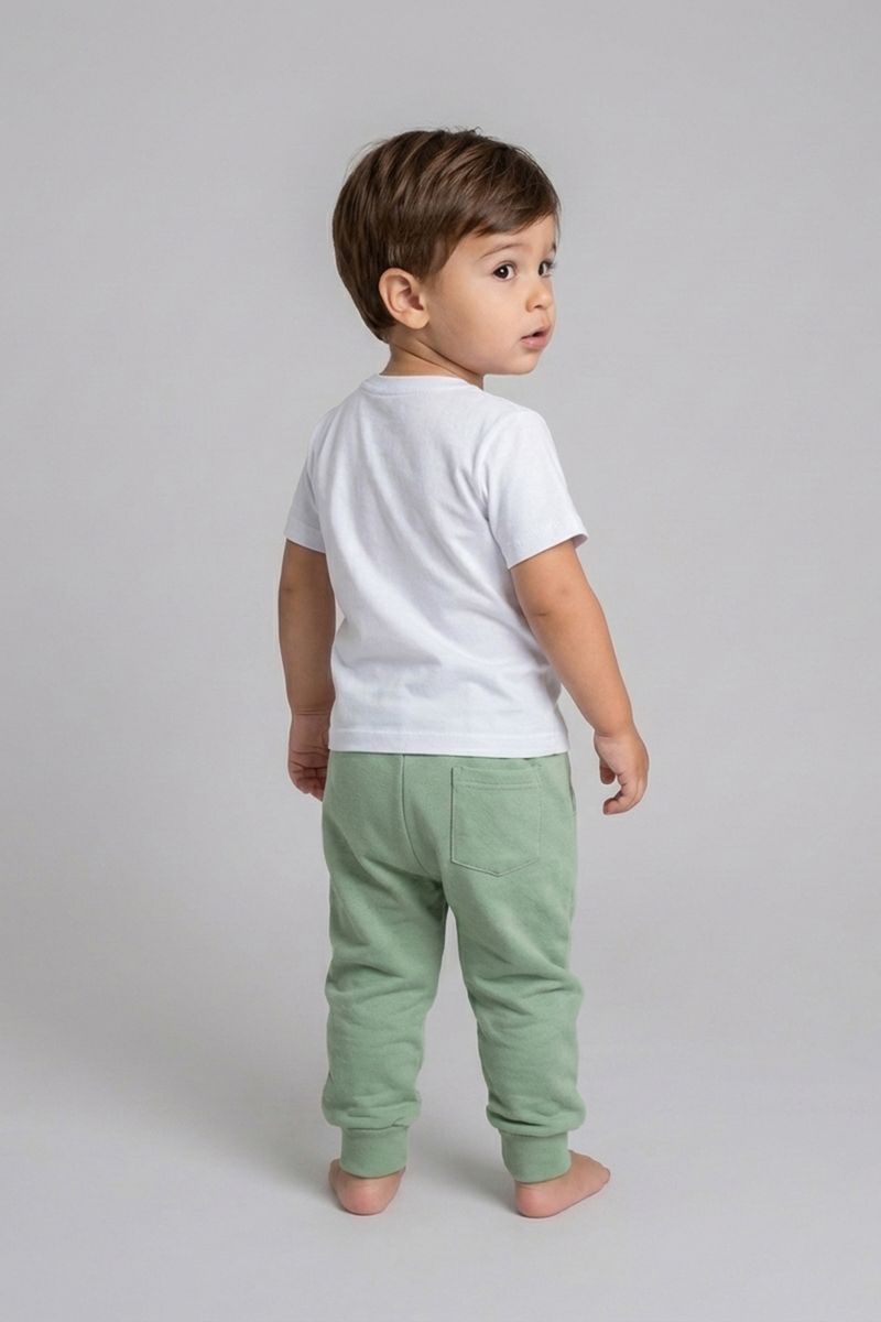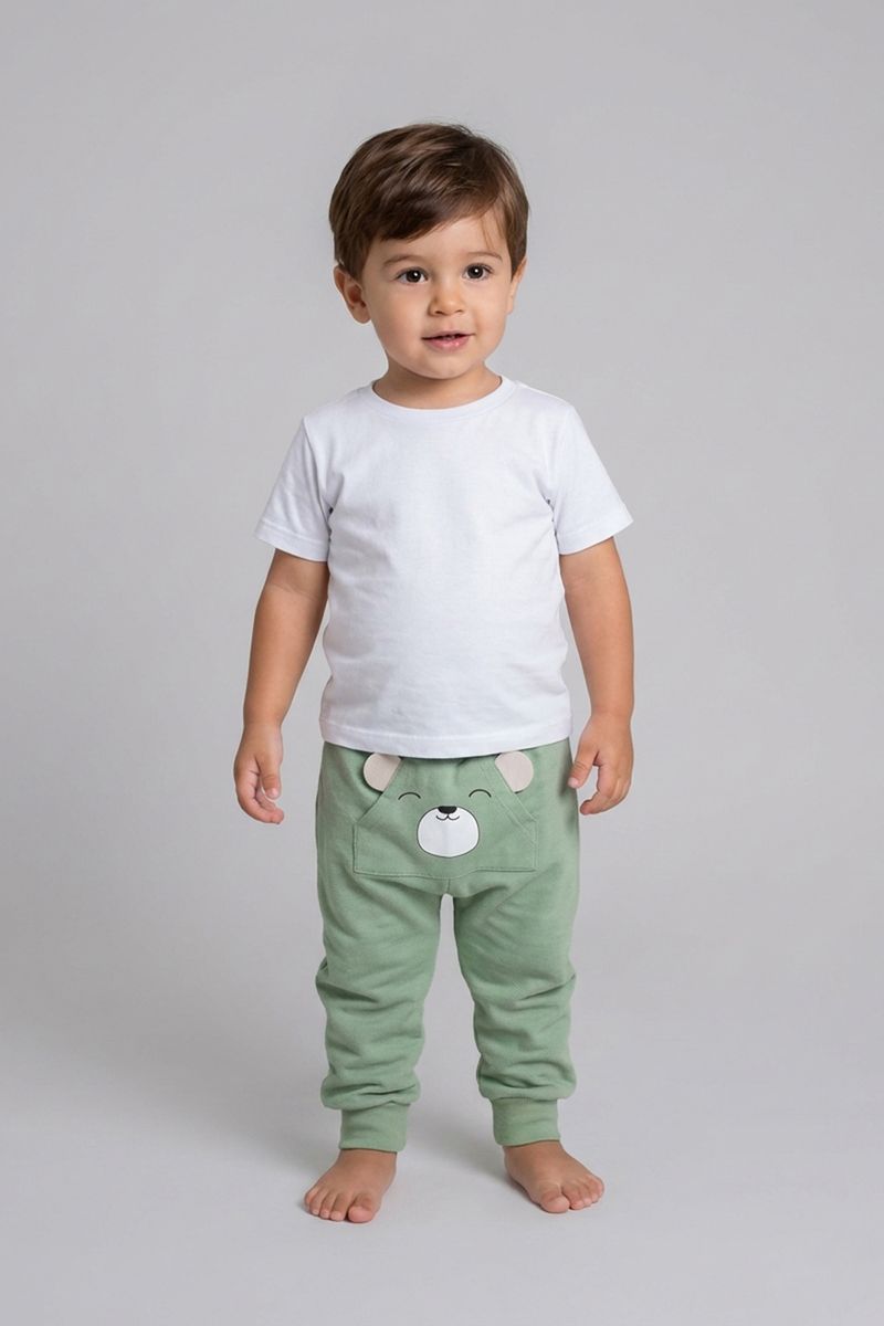 Combine a calça de moletom verde com blusas de algodão brancas ou coloridas para um visual despojado. Para um toque extra de estilo, adicione um tênis casual e um casaco leve. É uma peça versátil que se adapta a diversas ocasiões, criando looks confortáveis e cheios de personalidade para os pequenos.
