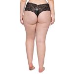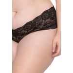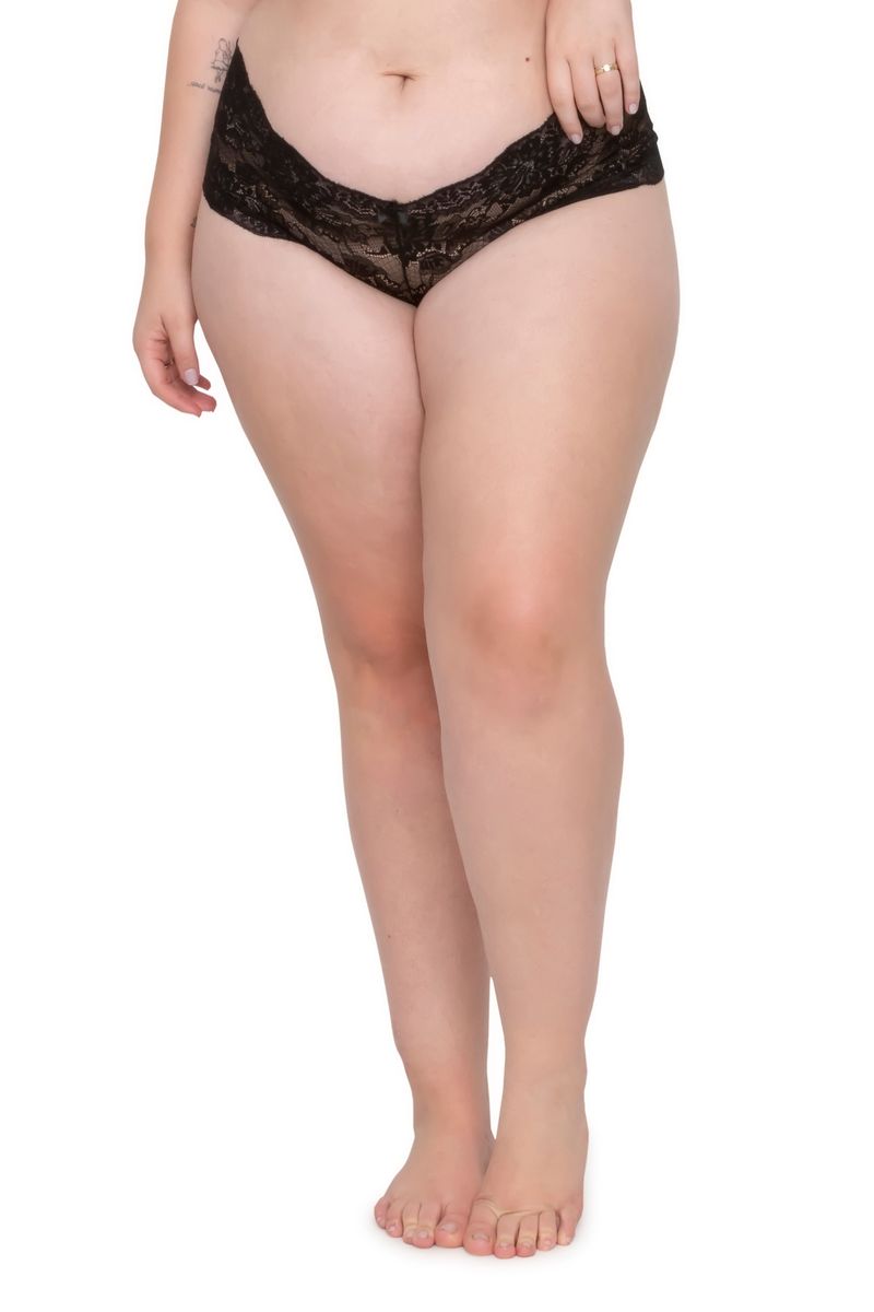 Calcinha feminina estilo caleçon, modelo plus size, na cor preta. Apresenta detalhes de renda na lateral, com lacinho na parte frontal. Na parte traseira, apresenta detalhes em renda com pequena abertura na parte de cima.