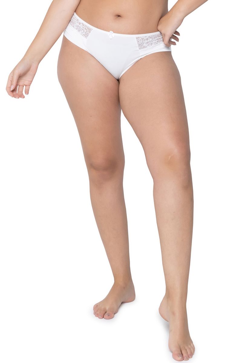 Calcinha modelo plus size, confeccionada em tecido renda. Possui laterais largas e transparência.