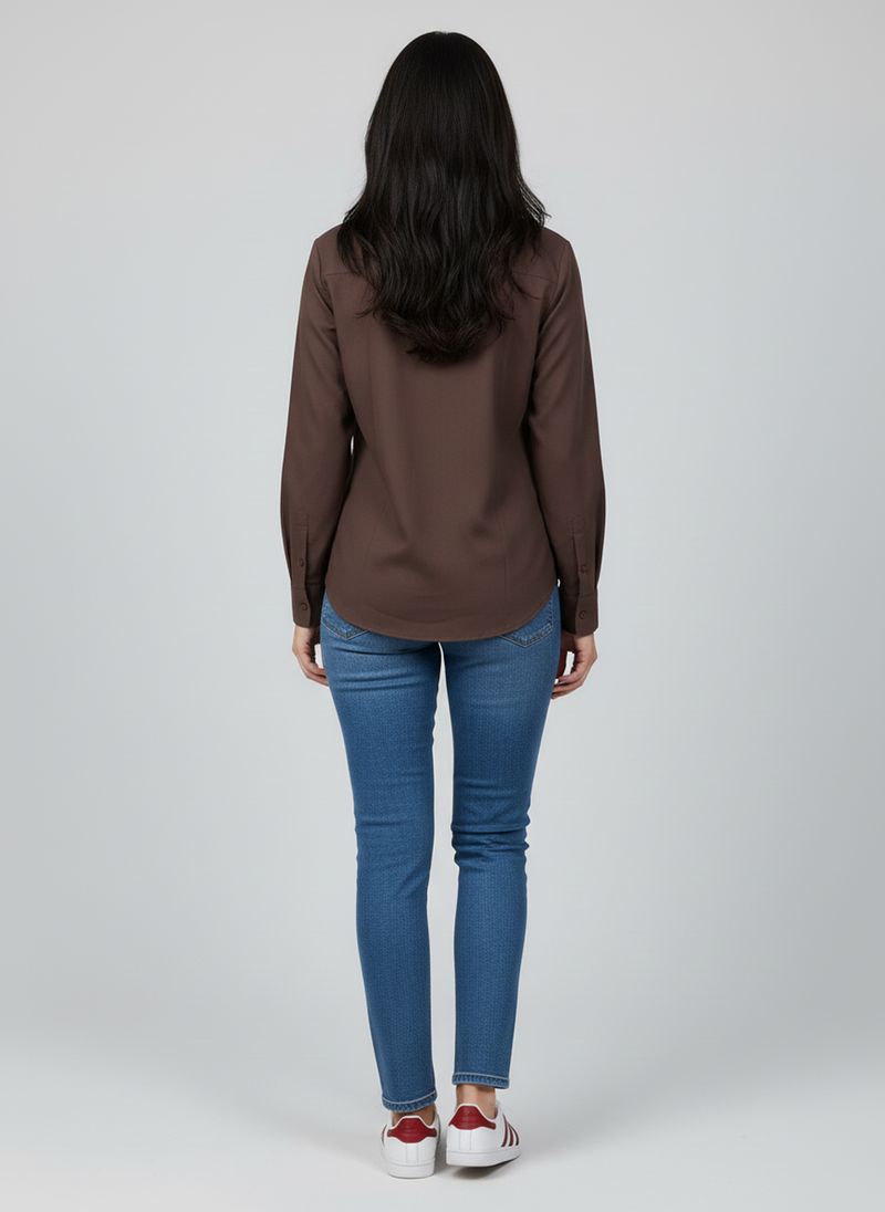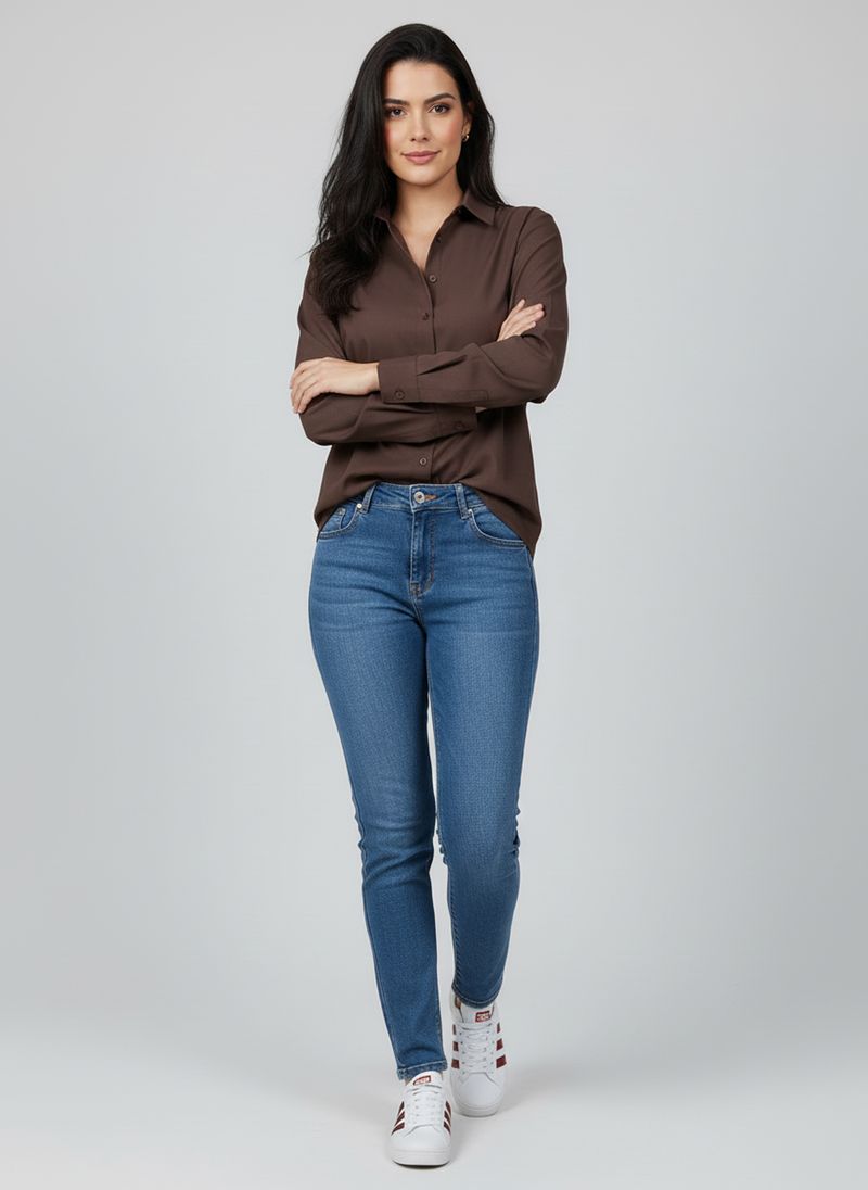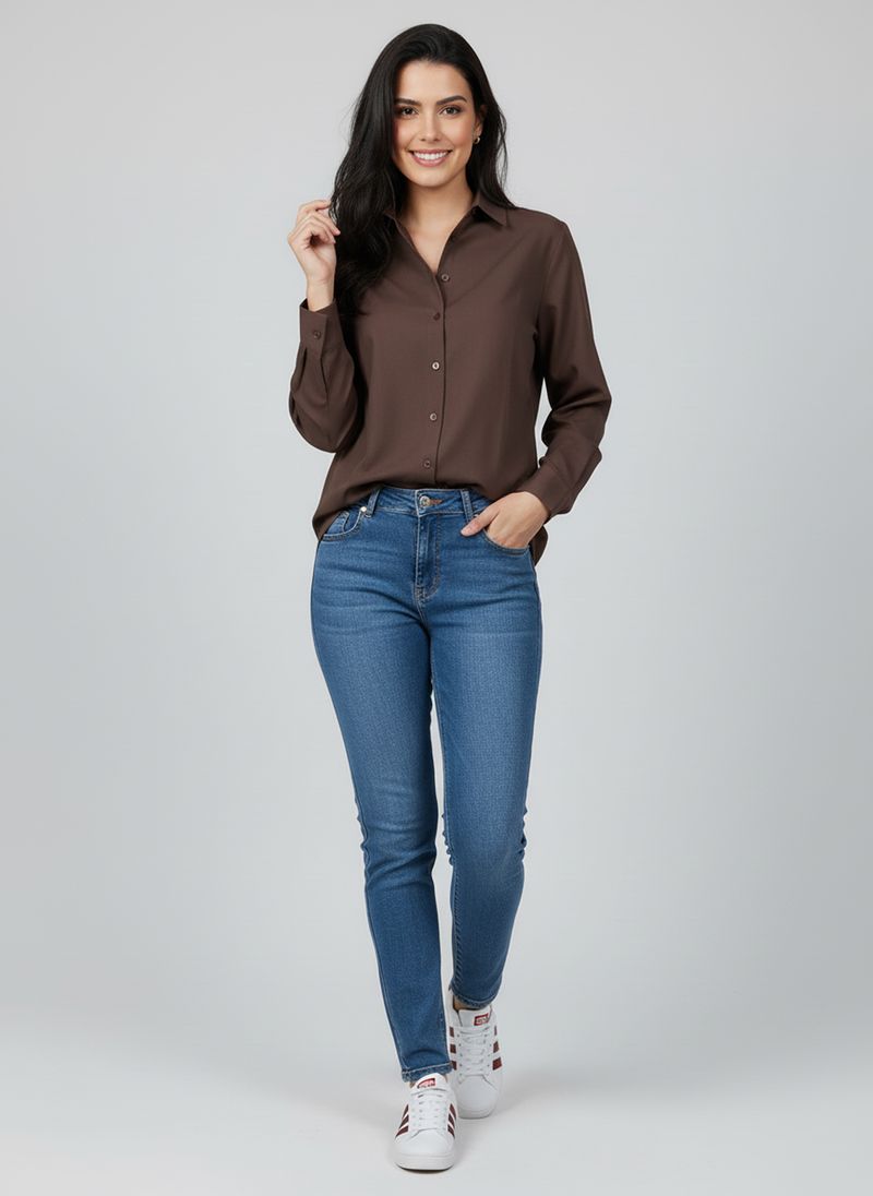 Combine sua camisa de linho marrom escuro com calças jeans para um visual casual chic, ou com calças de sarja em tons neutros para um estilo mais sofisticado. Para os pés, tênis brancos ou sandálias de tiras complementam o look com versatilidade. Adicione acessórios discretos para um toque final de moda.