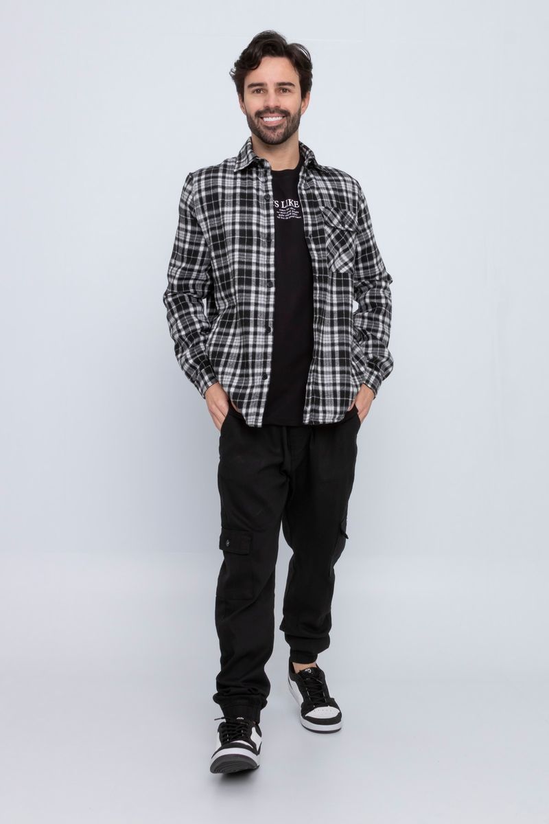 Camisa masculina flanelada com estampa xadrez. A peça possui gola dobrável, fechamento em botões no entremeio, manga longa, bolso e caimento reto.