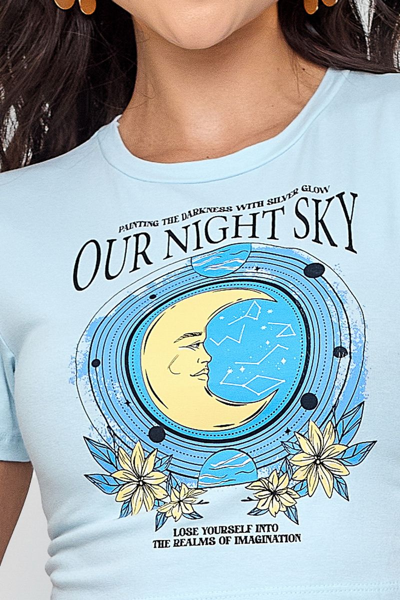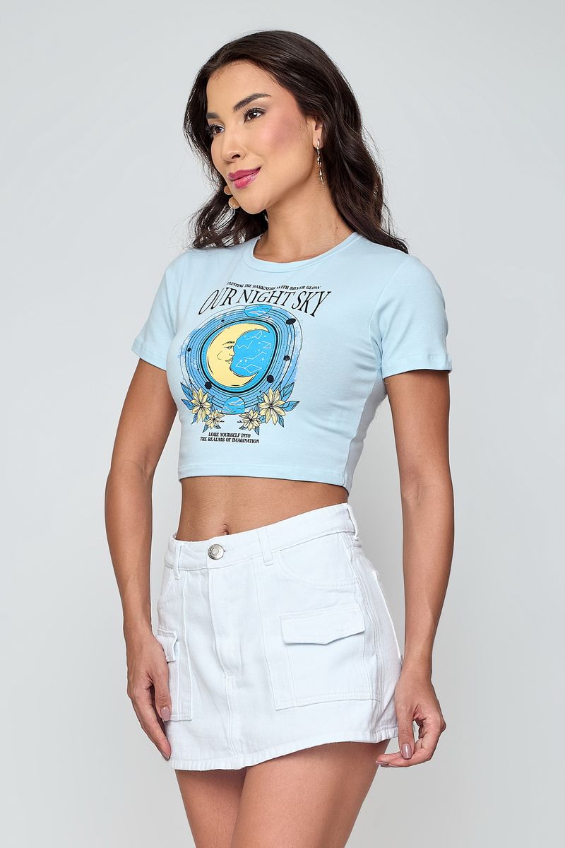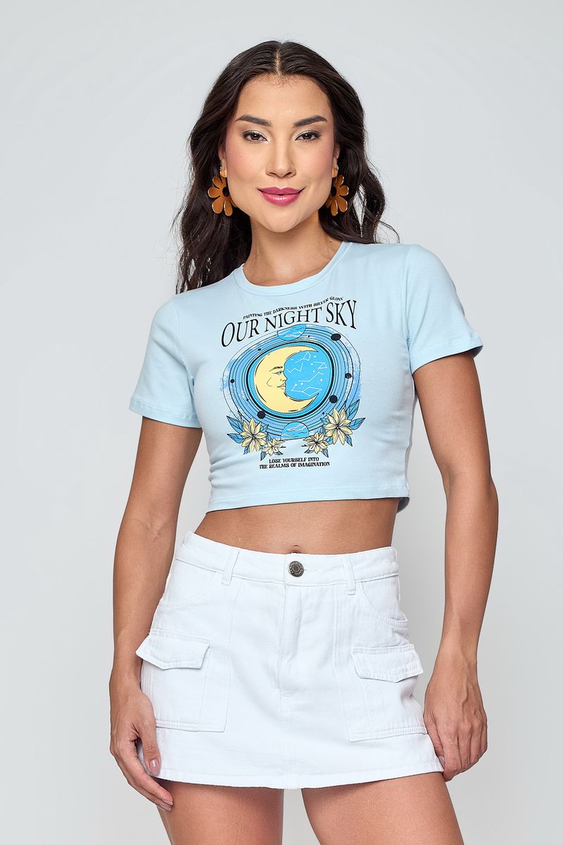 Camiseta cropped feminina com estampa Night Sky em azul claro. Moderna e descontraída.