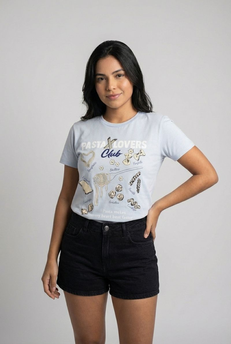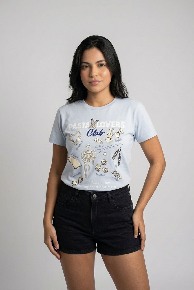 A Camiseta Feminina Pasta Lovers Club Azul Claro, 100% algodão, oferece conforto e toque suave. Estampa de massas italianas e a frase "Pasta makes my heart beat faster" trazem estilo divertido. Ideal para quem busca moda e personalidade.