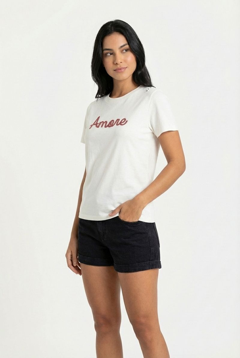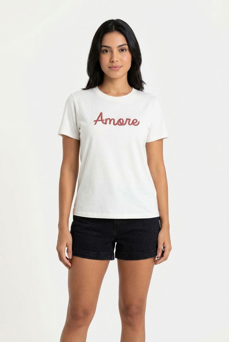 Camiseta Feminina Off White Bordado Amore em Relevo