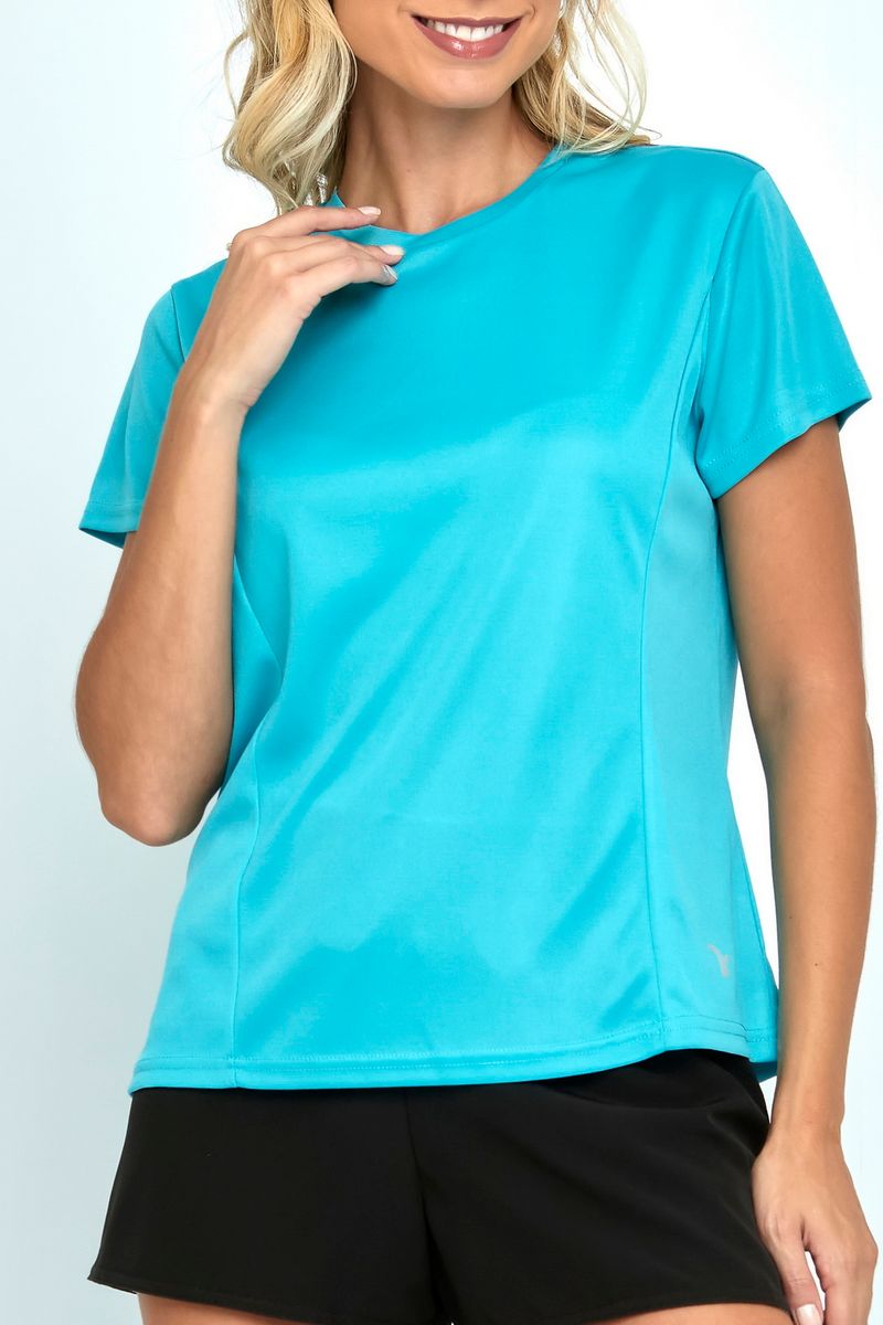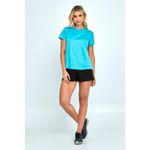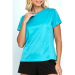 Camiseta feminina esportiva, manga curta, na cor azul. Confortável e prática, ideal para atividades físicas e lazer.