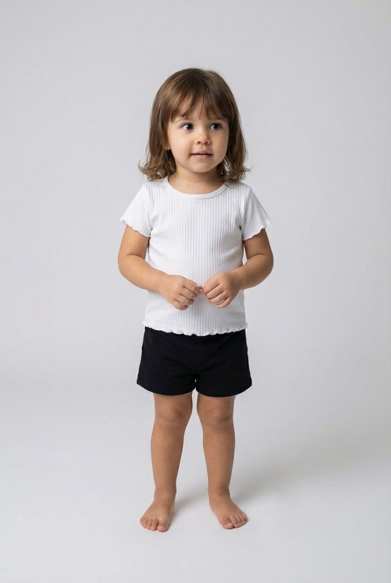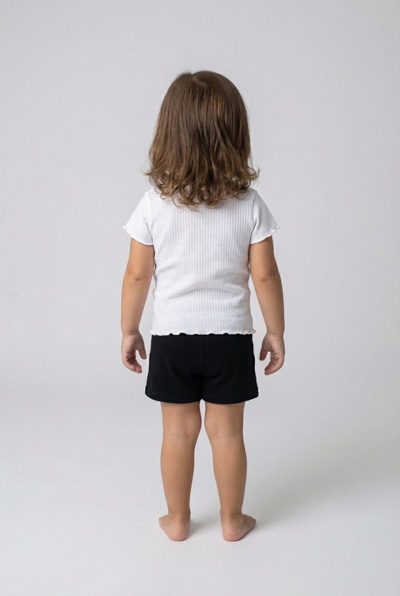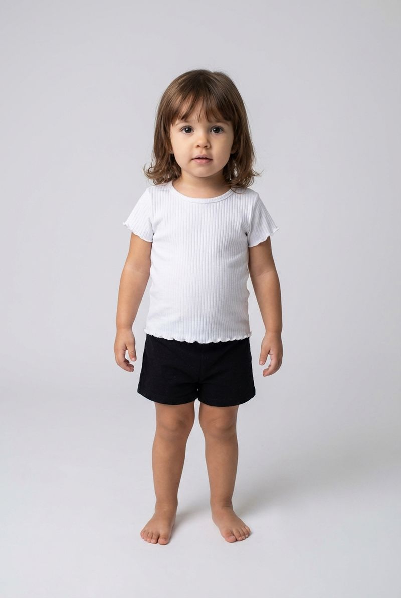 A blusa infantil Caedu, 100% algodão, garante conforto e estilo. Com design canelado e detalhes ondulados, esta peça branca é ideal para o dia a dia, proporcionando um toque suave e um visual encantador.
