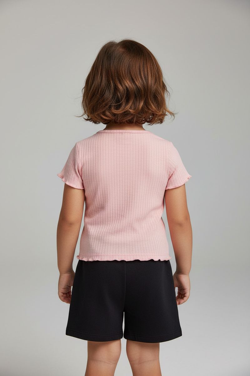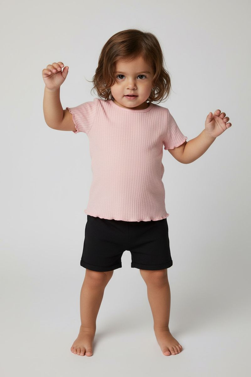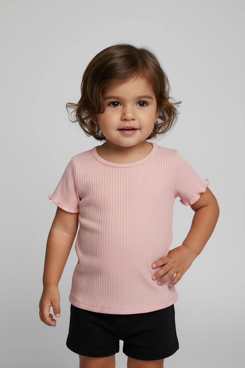 A blusa infantil Caedu em ribana rosa claro, 100% algodão, garante conforto e estilo. Com babado delicado nas mangas e barra, é a roupa menina ideal para um visual charmoso e moderno. Uma moda que sua pequena vai amar!
