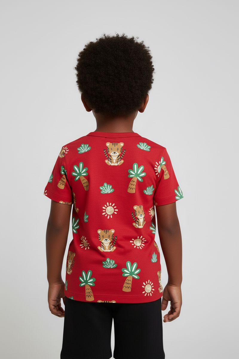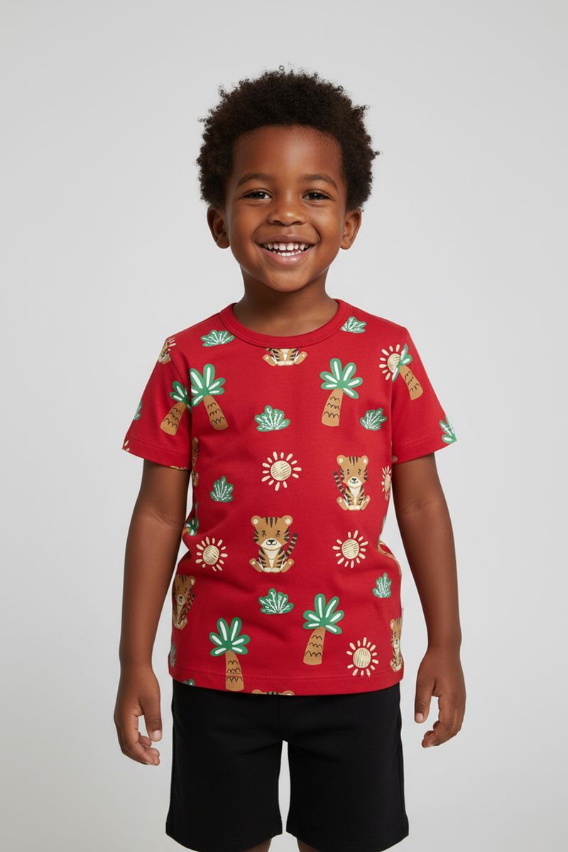 A Blusa Infantil Caedu Vermelha com estampa de Tigrinhos na Floresta é ideal para os pequenos. Confeccionada em 100% algodão, proporciona conforto e maciez. Seu design vibrante com tigres e palmeiras inspira aventuras, essencial na moda infantil.