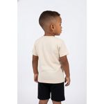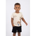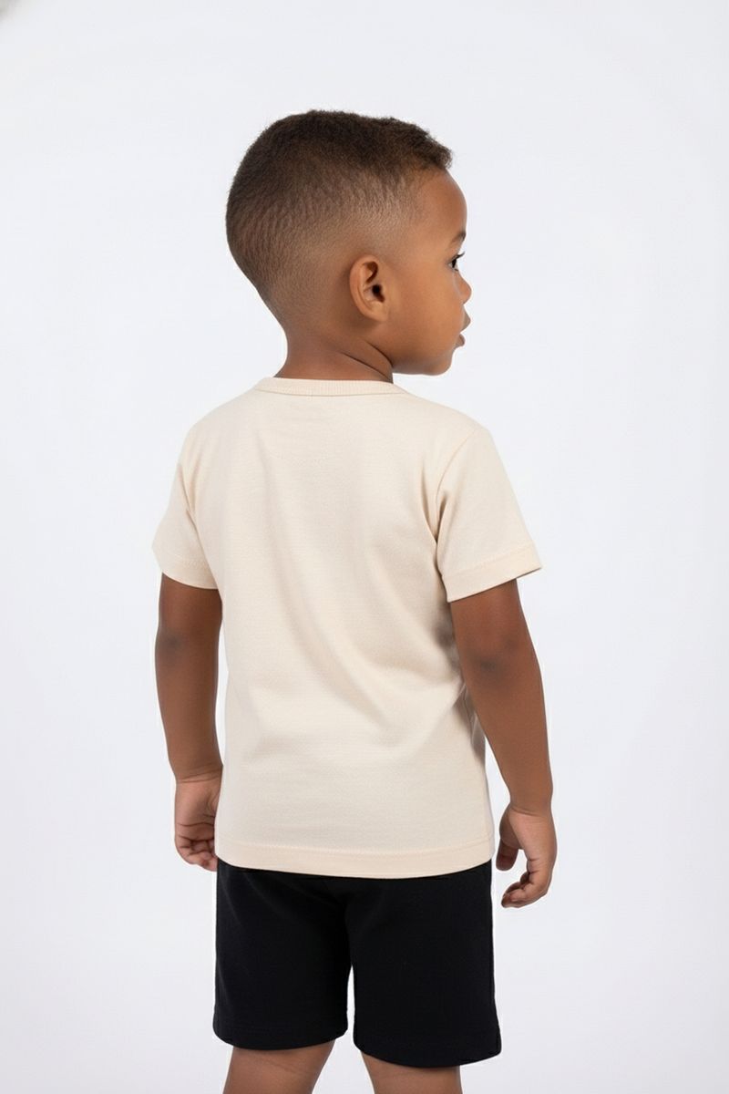 Combine esta camiseta bege claro com um short preto ou jeans para um visual casual e despojado. Para um toque mais divertido, adicione um tênis colorido e um boné. Em dias mais amenos, uma jaqueta leve pode complementar o look, criando um estilo versátil e cheio de charme para os pequenos aventureiros.