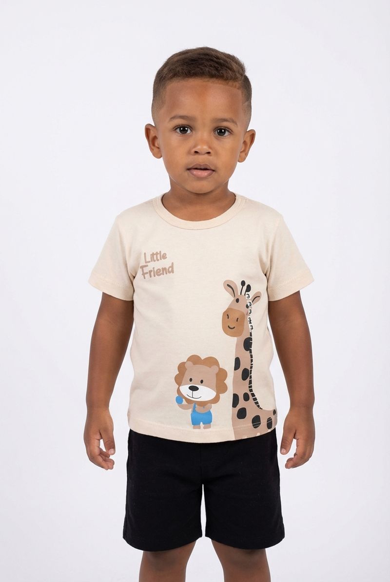 A Camiseta Infantil 'Little Friend' Caedu, em 100% algodão, é puro conforto. Sua cor bege claro e estampa de girafa e leão trazem alegria e estilo. Perfeita para o dia a dia, esta roupa infantil é macia e divertida.