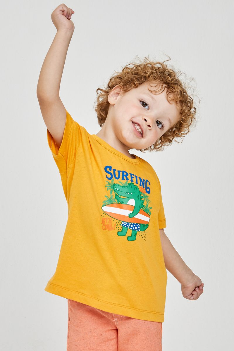 A Camiseta Infantil Caedu Jacaré Surf Amarelo Mostarda é a escolha perfeita para os pequenos aventureiros. Confeccionada em 100% algodão de meia malha, oferece máximo conforto e toque suave. Com estampa divertida de jacaré surfista, esta roupa infantil vibrante garante estilo e liberdade para brincar. Ideal para compor looks cheios de personalidade.
