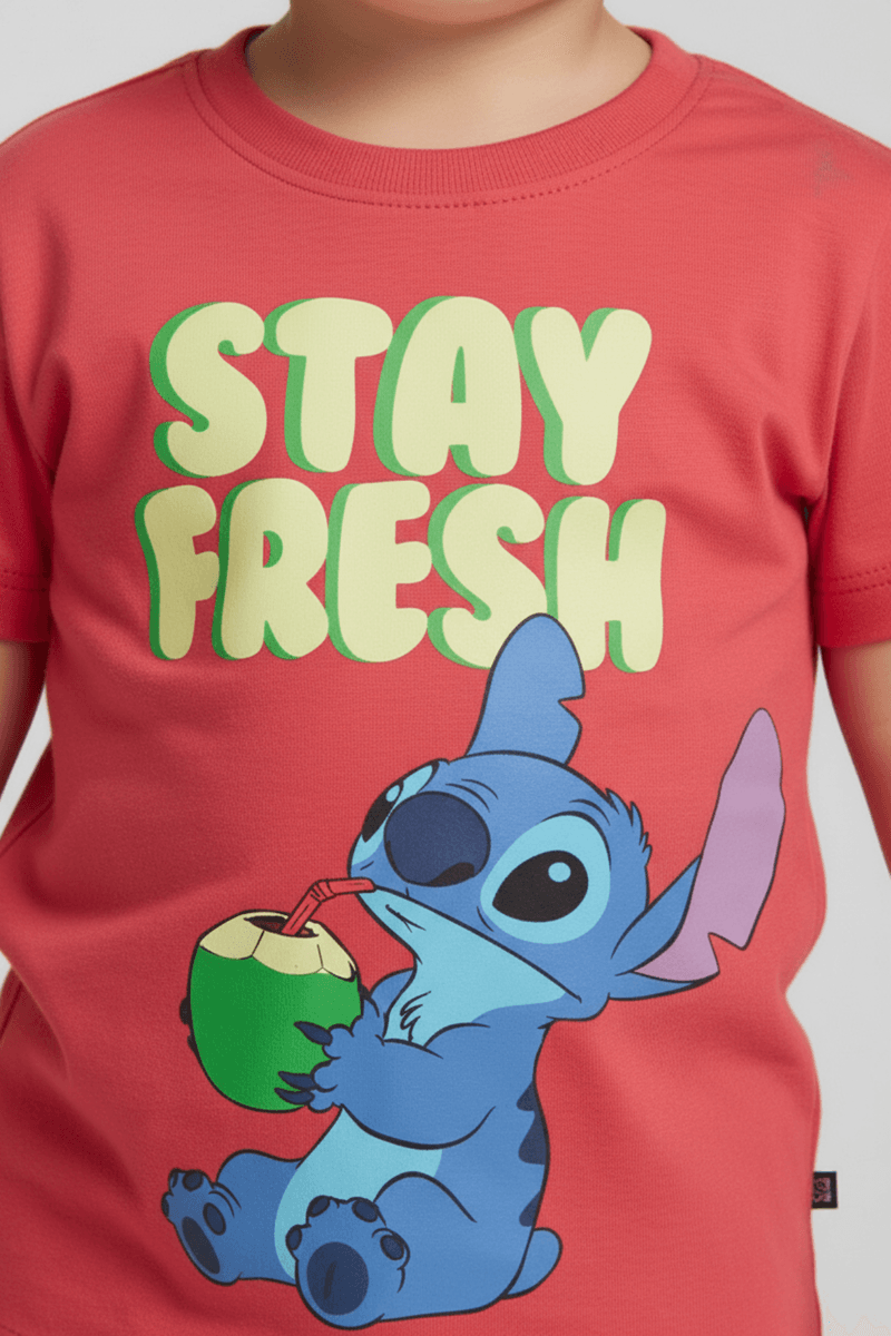 A Camiseta Infantil Caedu Stitch "Stay Fresh" em meia malha oferece conforto e estilo para os pequenos. Com sua vibrante cor vermelho médio e a divertida estampa do Stitch com "Stay Fresh", é a escolha perfeita para um look alegre e despojado. Ideal para o dia a dia, esta roupa infantil garante liberdade de movimento e muita diversão.