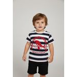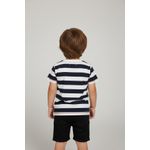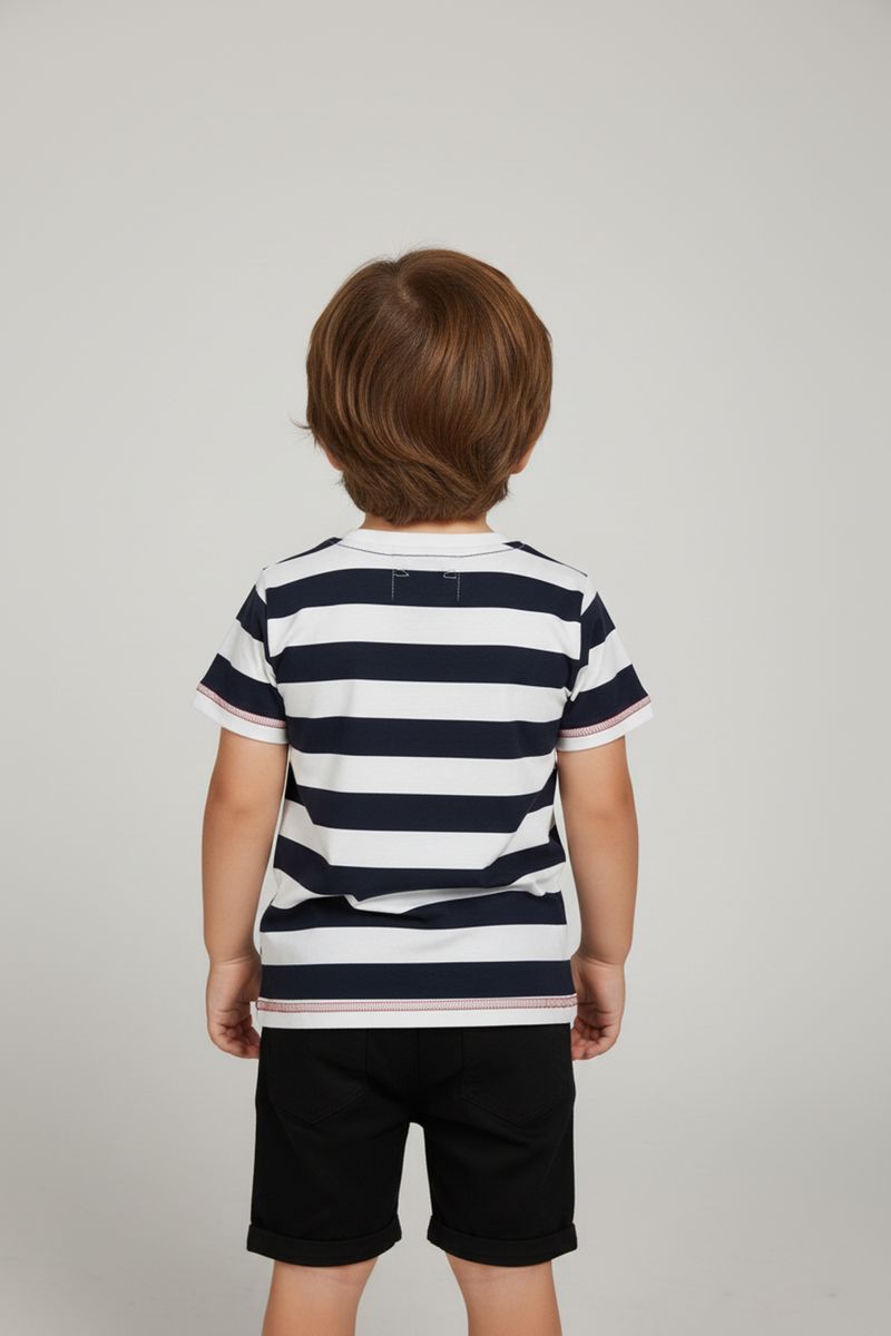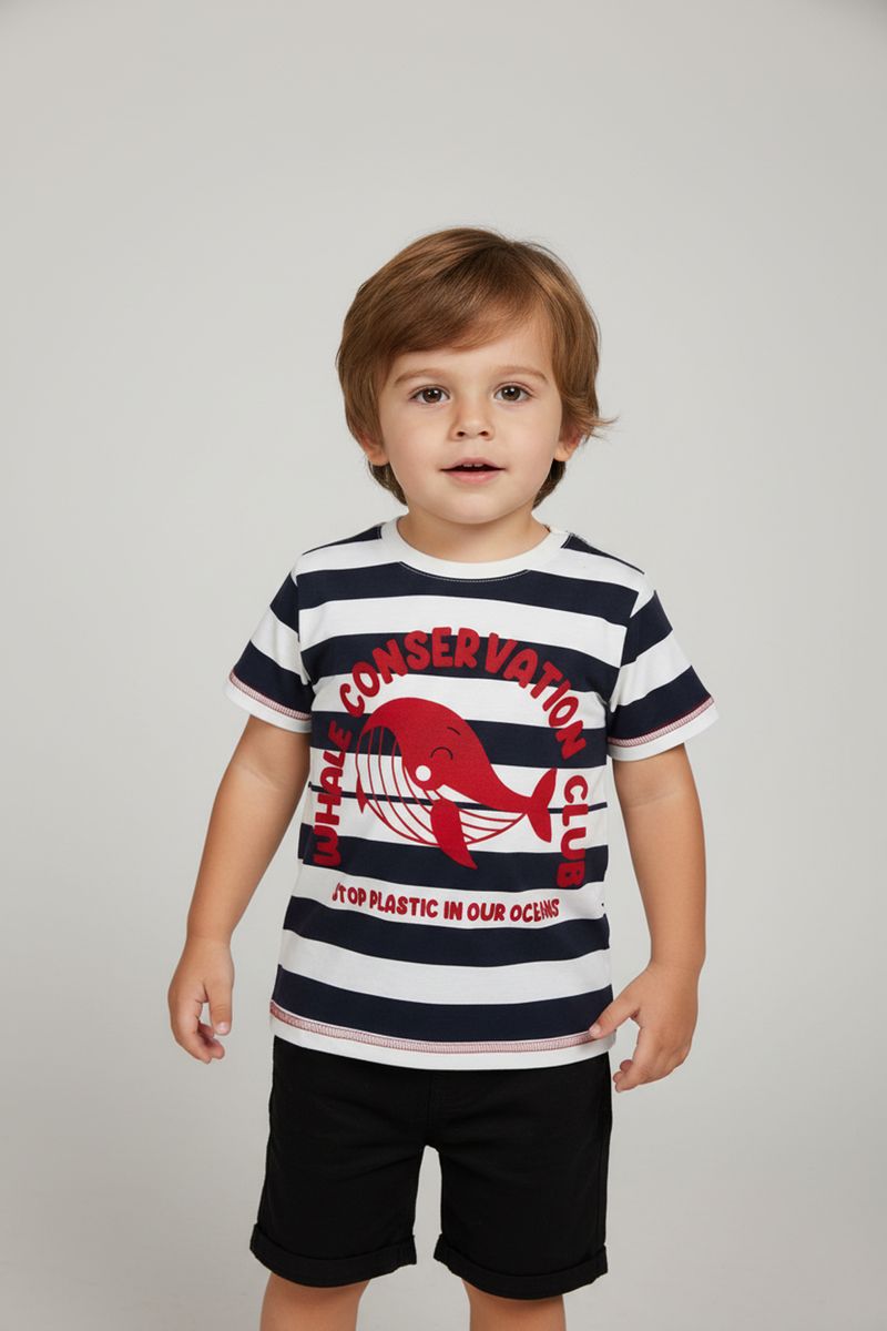 A blusa infantil Caedu combina conforto e estilo. Confeccionada em 100% algodão de meia malha, oferece toque suave e liberdade. Com listras azul marinho e off white e estampa flocada de baleia 'Conservation Club', esta roupa infantil é ideal para um visual divertido e consciente.