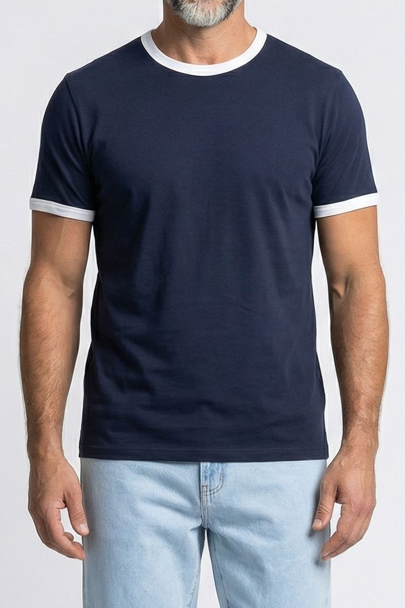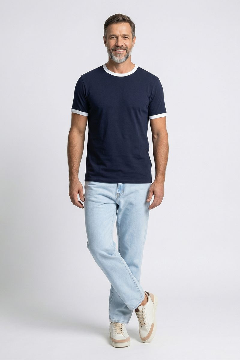 A Camiseta Masculina Ringer Caedu é a peça ideal para quem busca estilo e conforto. Com seu design em azul marinho e detalhes brancos contrastantes na gola e mangas, esta camiseta 100% algodão oferece um visual moderno e versátil. Perfeita para compor looks casuais com a moda Caedu.
