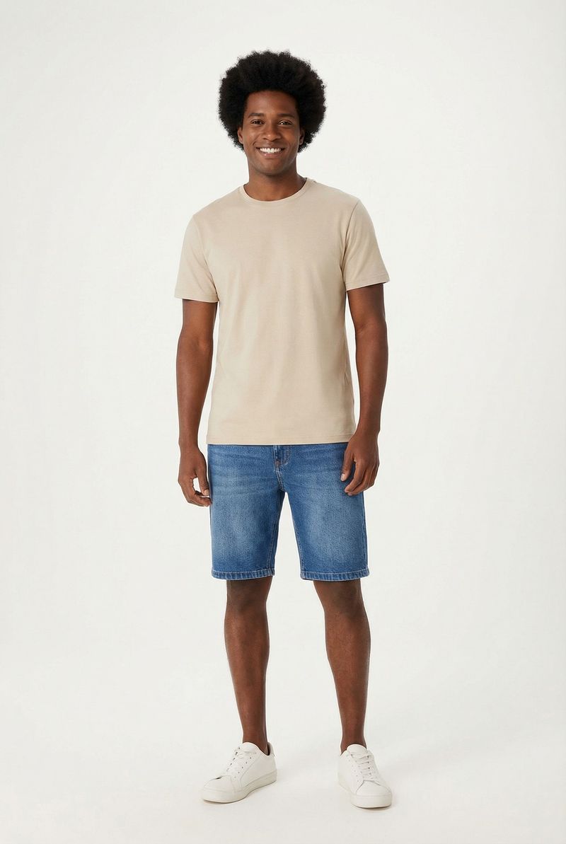 Combine a Camiseta Masculina Premium Caedu com bermuda jeans azul e tênis branco para um look casual e moderno. Para um estilo despojado, use com calças chino e sapatênis. Uma jaqueta leve complementa o visual, criando um conjunto versátil e cheio de moda.