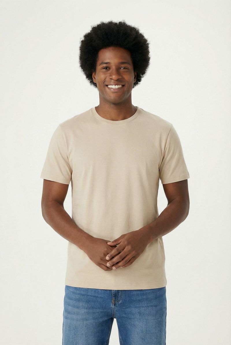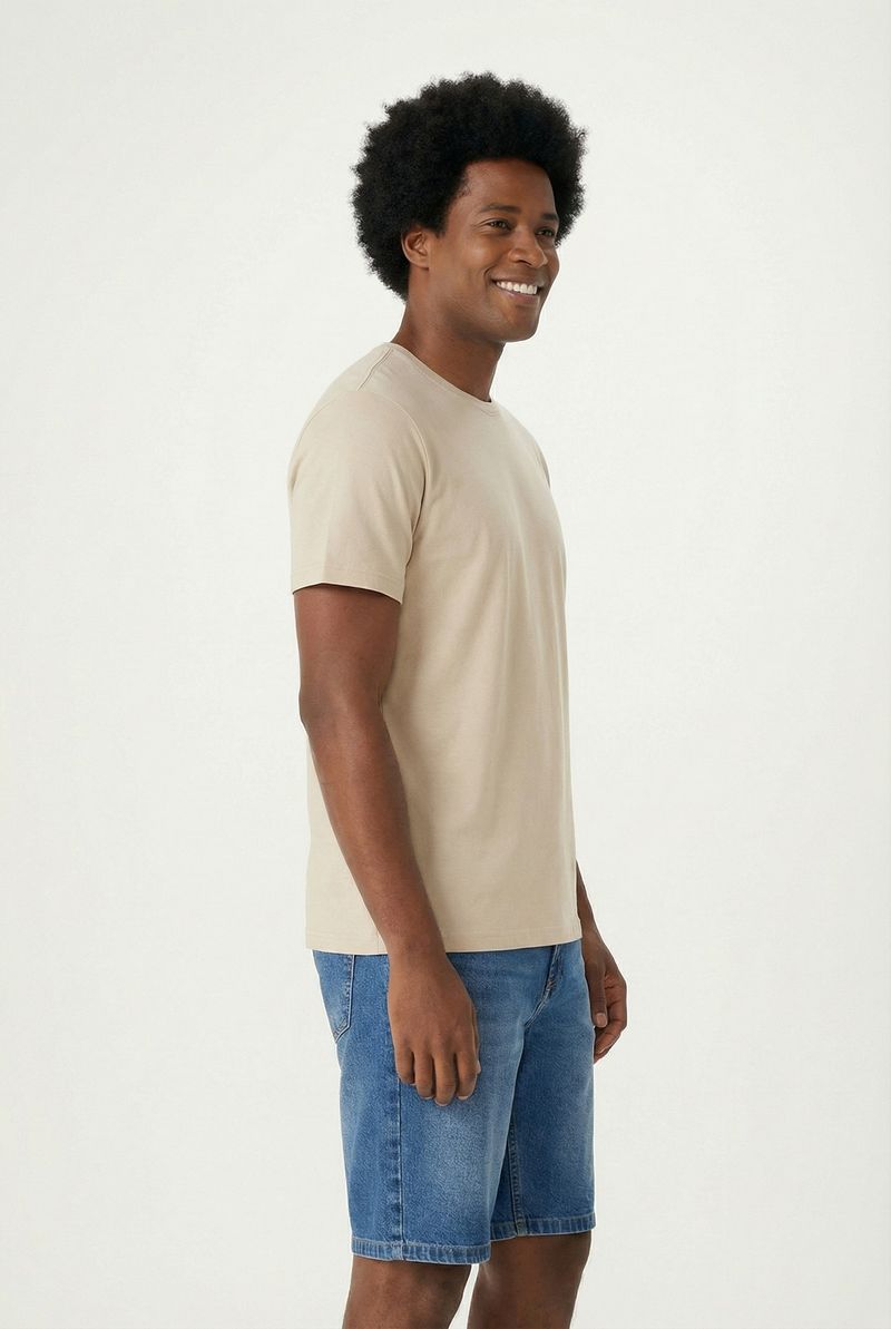A Camiseta Masculina Premium Caedu em bege claro é essencial. Feita em 100% algodão de meia malha, oferece conforto e caimento. Seu tom terroso, super em moda, garante um visual sofisticado e versátil.