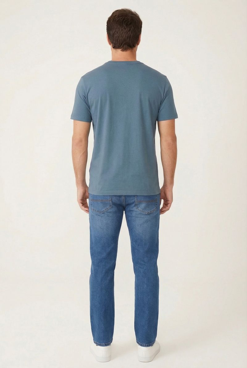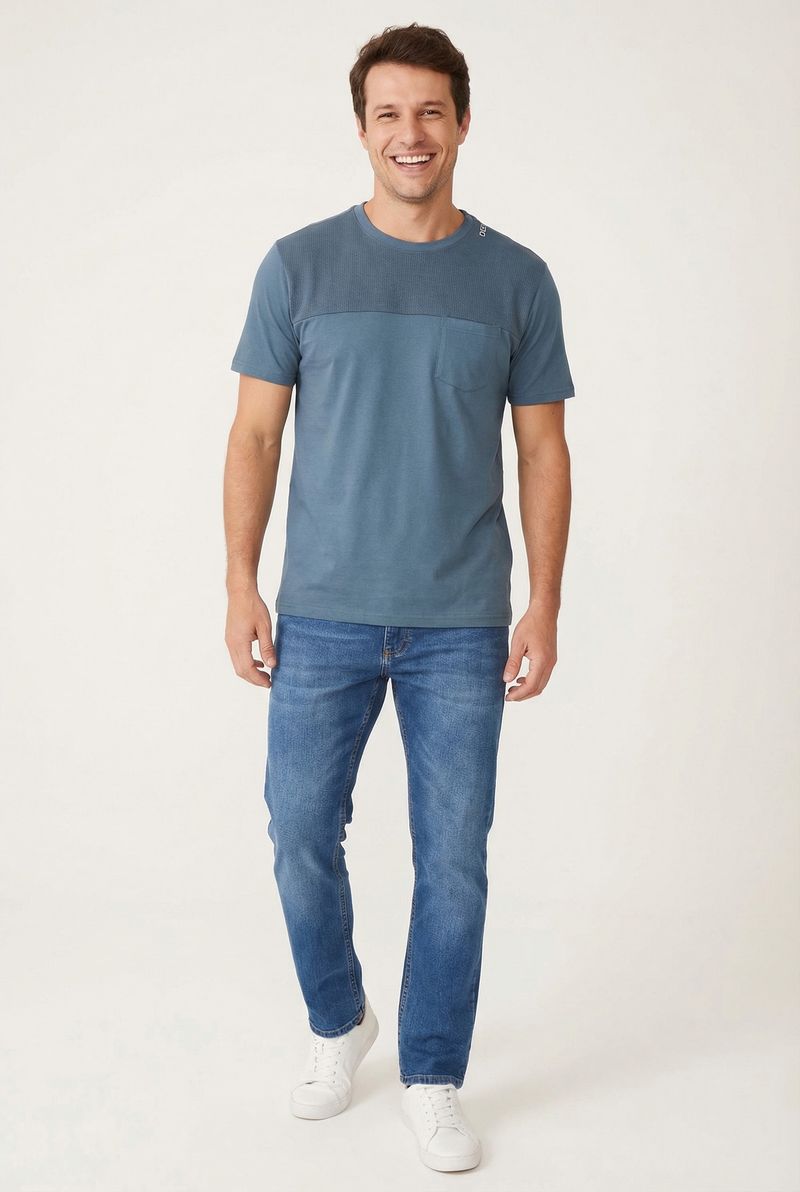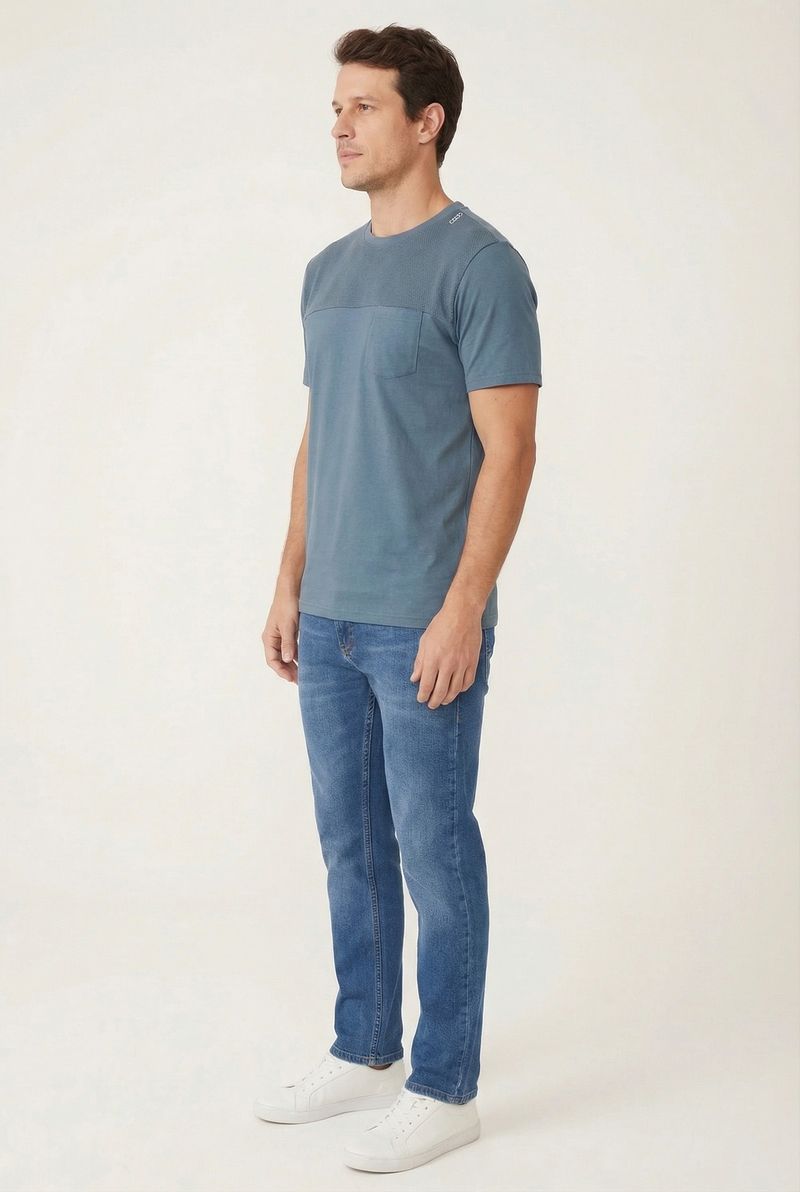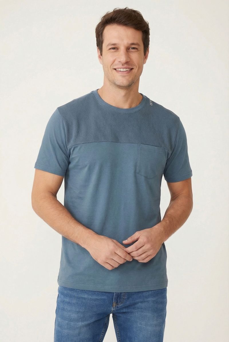 A Camiseta Masculina Casual Caedu em azul petróleo une conforto e estilo. Confeccionada em meia malha 100% algodão, possui detalhe texturizado e bolso, ideal para um visual moderno e versátil. Essencial para compor suas roupas com praticidade.