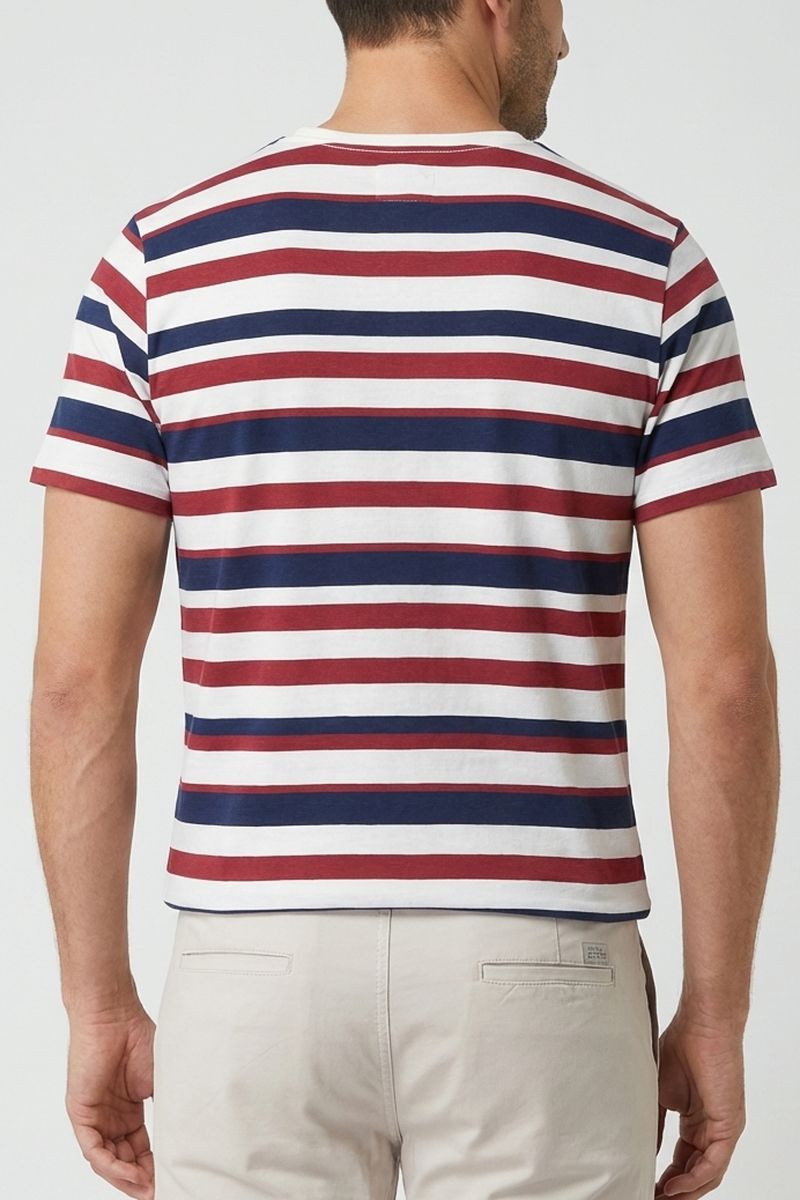 Sinta o conforto e a moda com a Camiseta Masculina Casual Caedu. Confeccionada em 100% algodão de meia malha, esta peça oferece toque suave e caimento perfeito. Seu design com listras vermelhas em tom médio garante um visual moderno e versátil para o dia a dia. Uma roupa essencial para seu guarda-roupa.