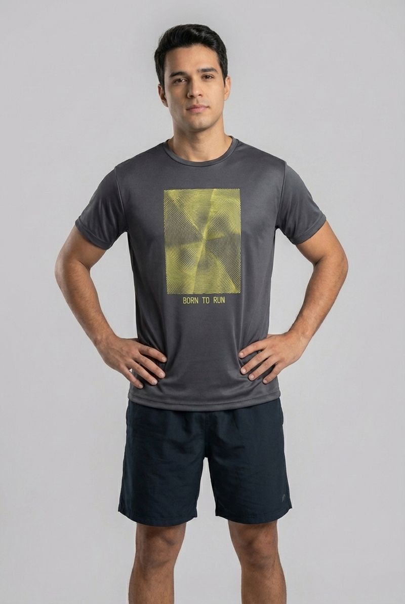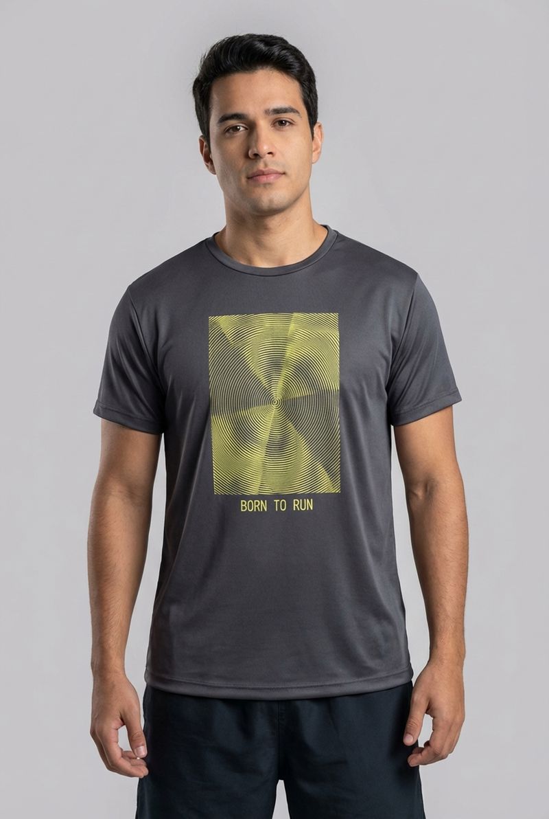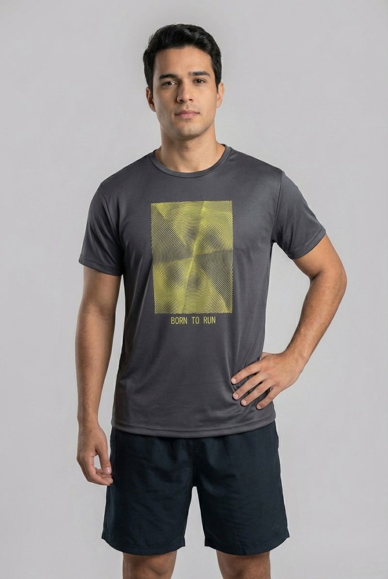Sinta a energia com a Camiseta Masculina Esportiva Caedu, ideal para quem busca conforto e estilo. Feita em 100% poliéster na cor chumbo, possui uma estampa vibrante 'Born to Run' com design espiral. Perfeita para suas atividades, esta roupa combina moda e funcionalidade para o homem moderno.