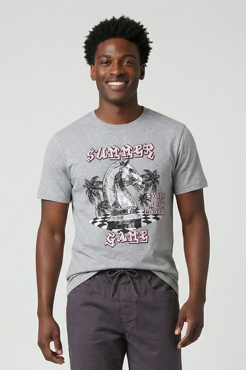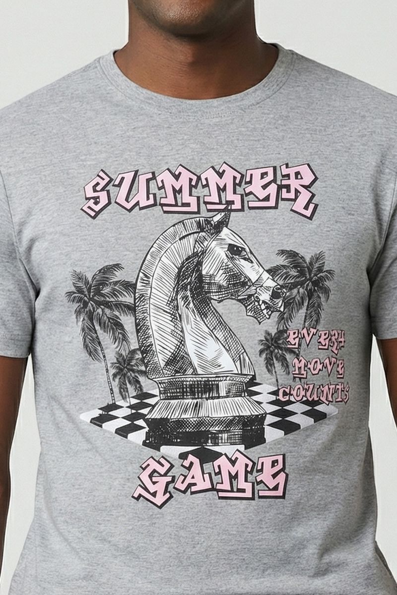 Estampa: cavalo de xadrez e coqueiros, com as palavras "SUMMER" e "GAME" e a frase "EVERY MOVE COUNTS"