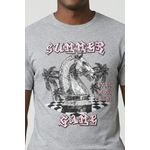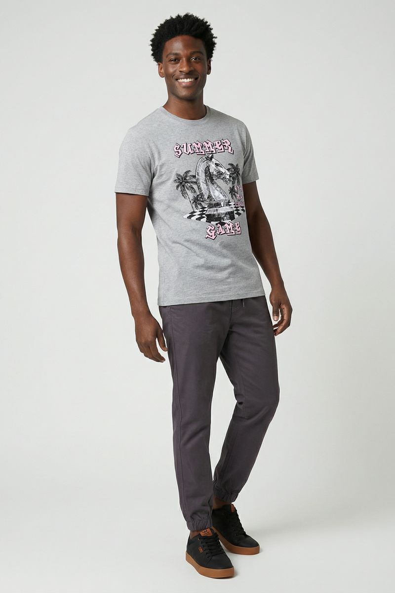Vista o conforto e estilo com a camiseta masculina da Caedu. Em 100% algodão e meia malha, oferece toque suave. A estampa 'Summer Game' com cavalo de xadrez e coqueiros traz um visual moderno e inspirador para suas roupas.