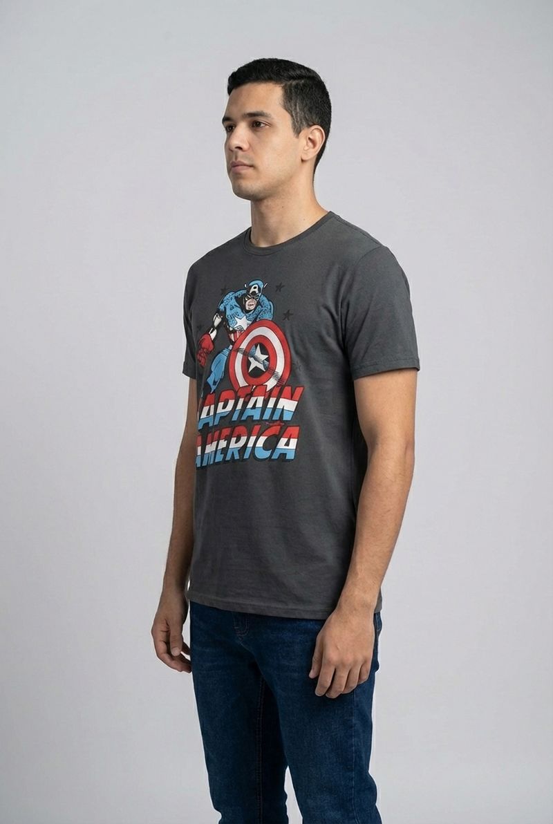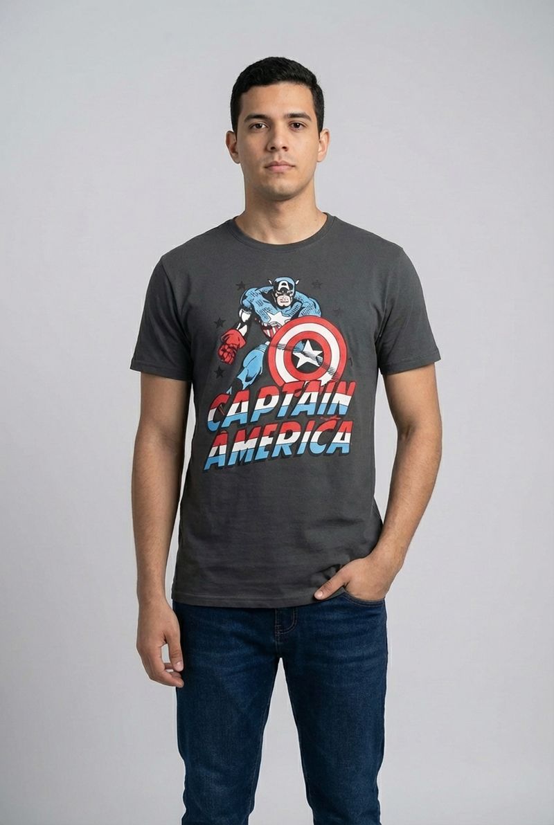Vista o espírito de um herói com a Camiseta Masculina Capitão América Marvel Chumbo da Caedu. Confeccionada em 100% algodão de meia malha, esta roupa masculina oferece conforto superior e um toque suave. Sua estampa vibrante do Capitão América em pose de ação, com seu escudo icônico, garante um visual poderoso e cheio de personalidade para os fãs da Marvel. Ideal para quem busca moda e autenticidade.