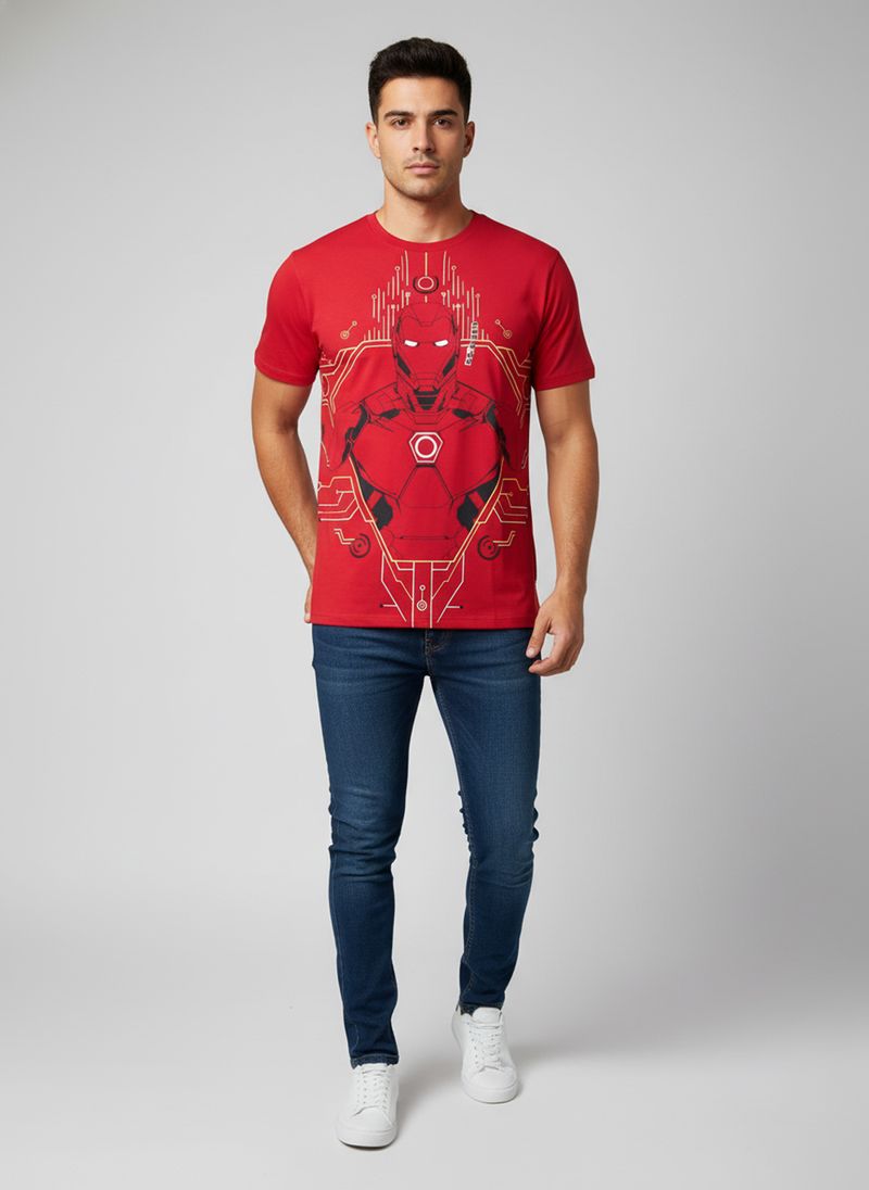 A Camiseta Masculina Homem de Ferro Caedu combina moda e paixão por heróis. Feita em meia malha 100% algodão, garante conforto. Seu vibrante vermelho médio e a estampa tecnológica do Homem de Ferro destacam seu estilo, perfeita para quem busca roupas autênticas.