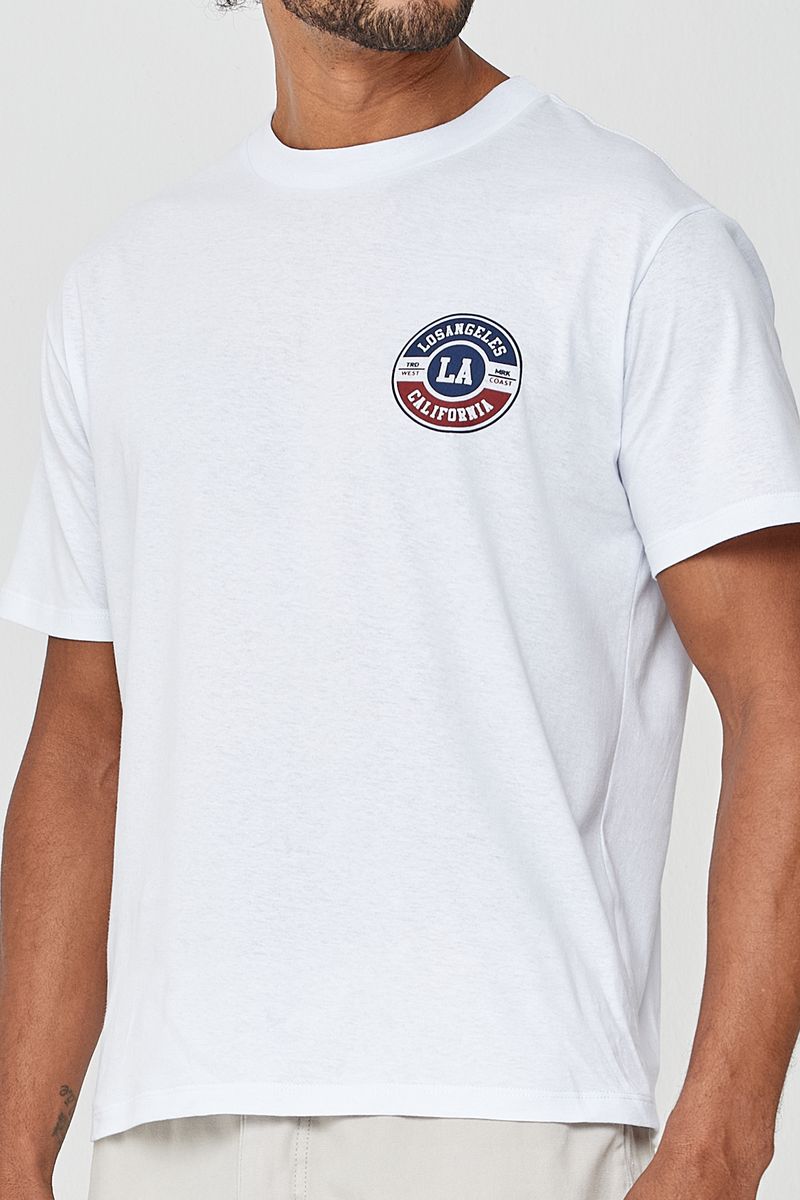 Eleve seu estilo com a Camiseta Masculina Caedu Los Angeles Branca. Confeccionada em 100% algodão e meia malha, oferece conforto e durabilidade. Seu design moderno com estampa "Los Angeles California" é perfeito para quem busca moda e versatilidade.