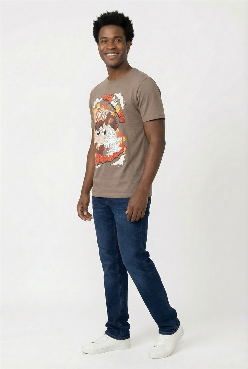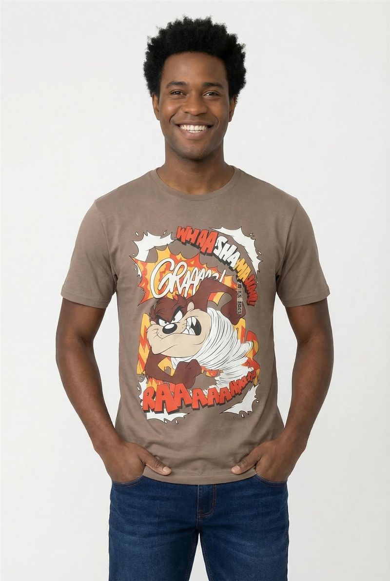 Eleve seu estilo com a Camiseta Masculina Taz Fúria da Caedu. Confeccionada em meia malha 100% algodão, esta peça oferece conforto inigualável e um toque macio para o seu dia a dia. Sua cor marrom escuro, parte dos elegantes tons terrosos, garante um visual moderno e de alto nível de moda, enquanto a estampa vibrante do Taz adiciona personalidade.