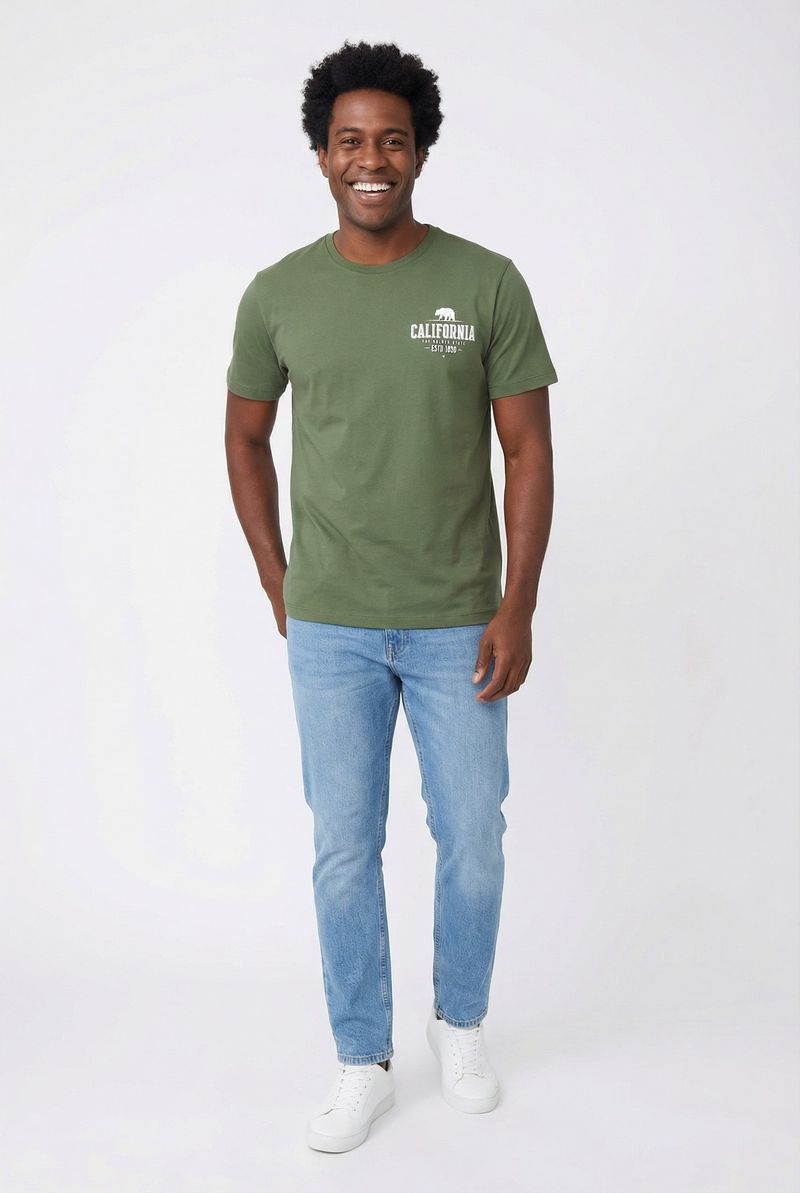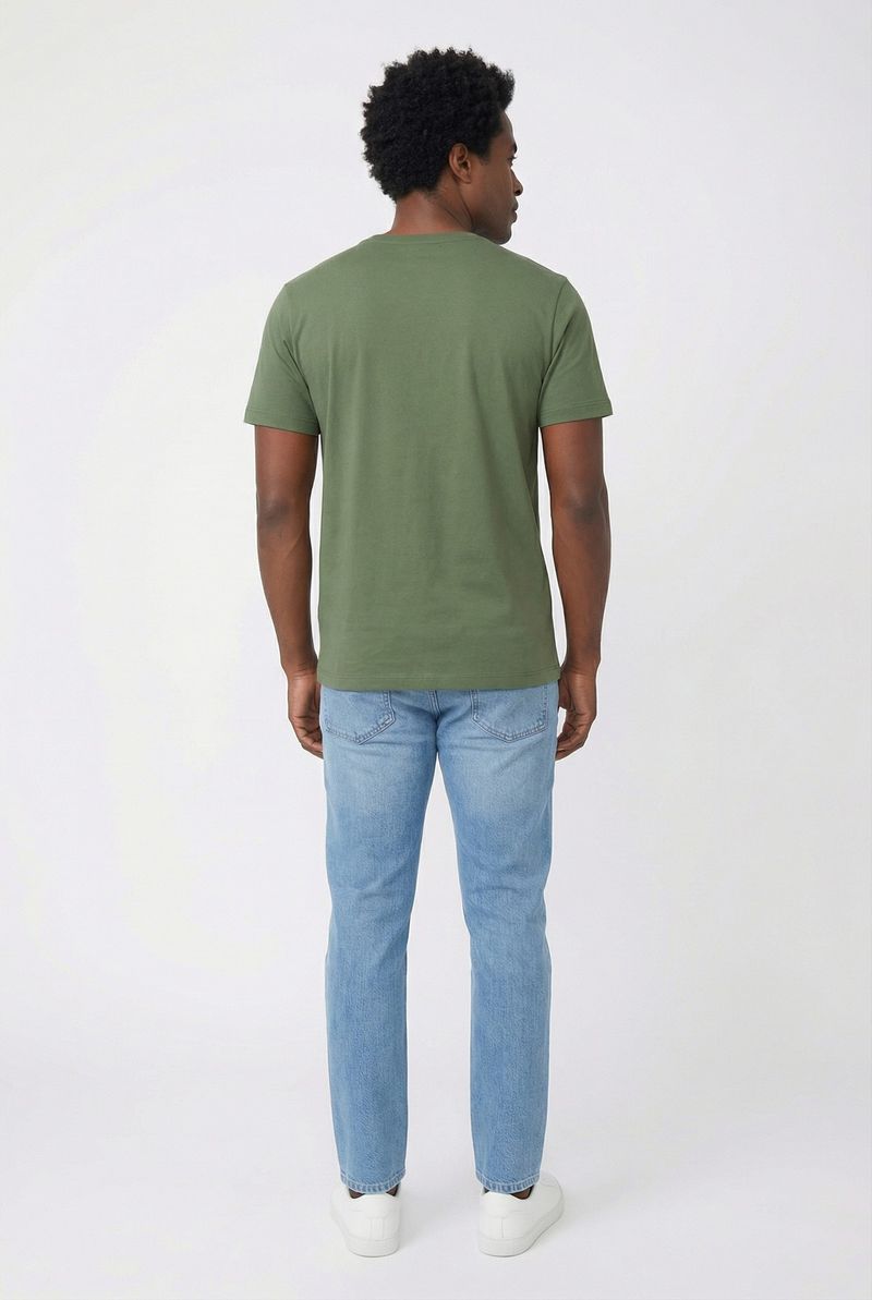 Combine sua camiseta verde-oliva com jeans claro para um look casual e descontraído, como visto na imagem do produto. Para um toque mais urbano, experimente com calças cargo ou bermudas. Complete o visual com tênis brancos para um estilo moderno e confortável, ou sapatênis para uma pegada mais arrumada. Adicione um relógio ou pulseiras para um toque final.