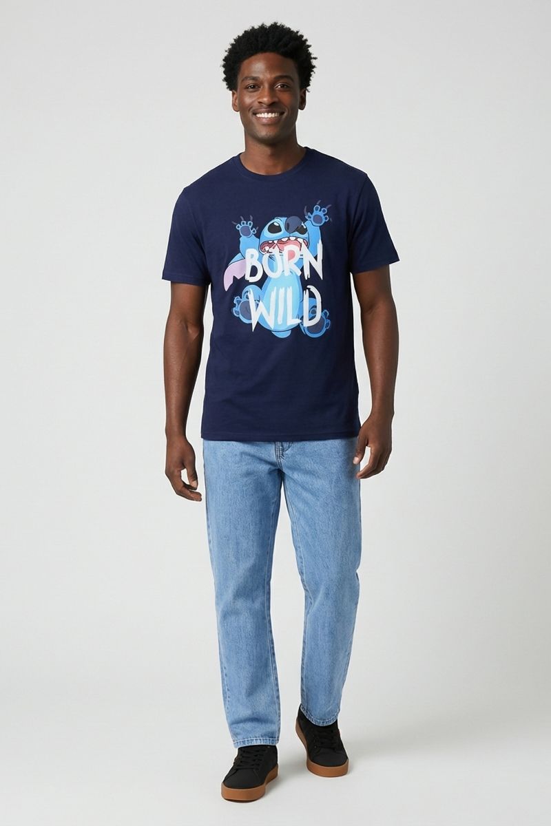 A Camiseta Masculina Stitch Caedu oferece o máximo conforto para o seu dia a dia. Confeccionada em 100% algodão e meia malha, esta peça na cor marinho com estampa do Stitch garante um toque suave e um estilo despojado para a moda masculina.