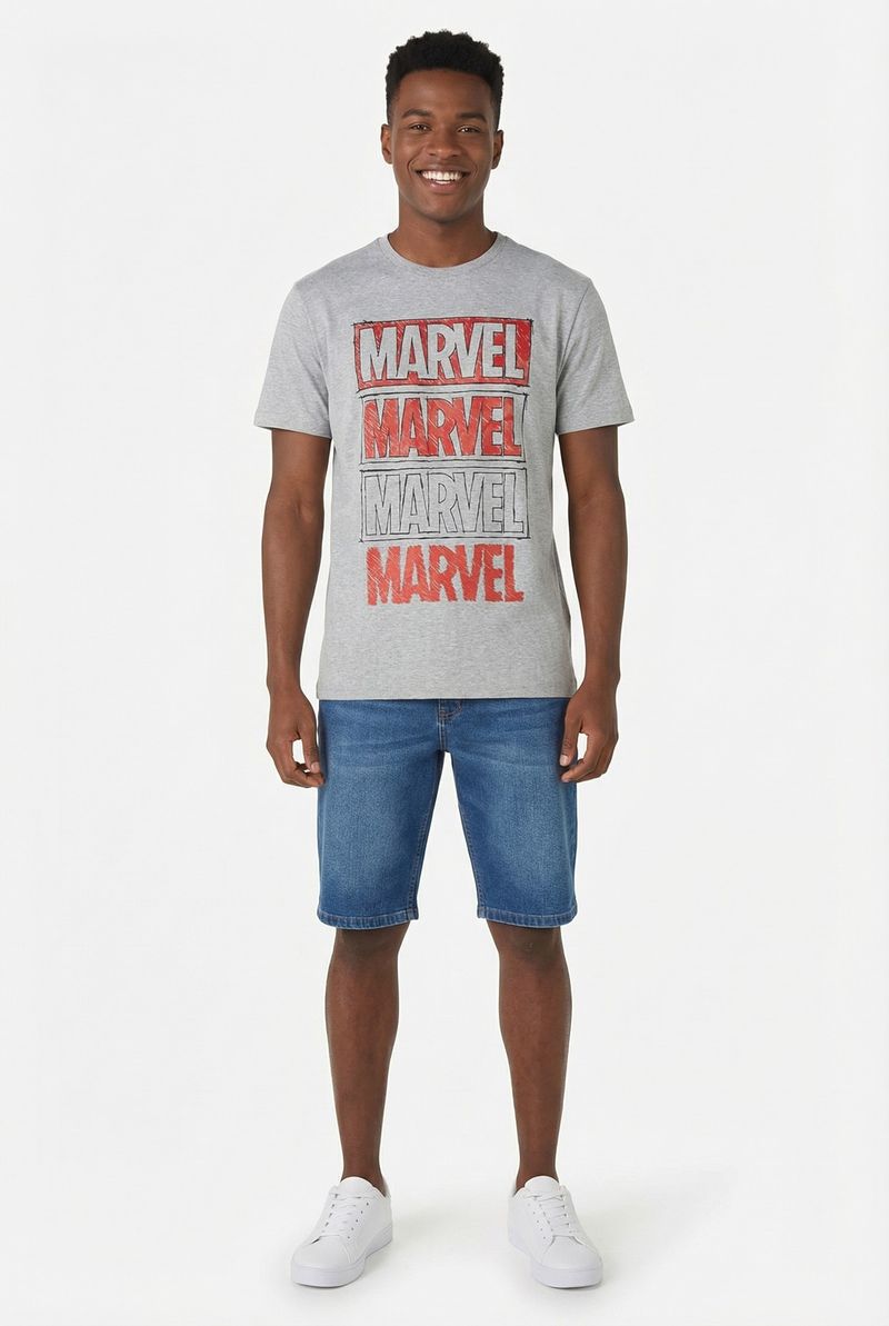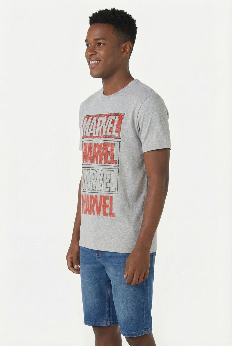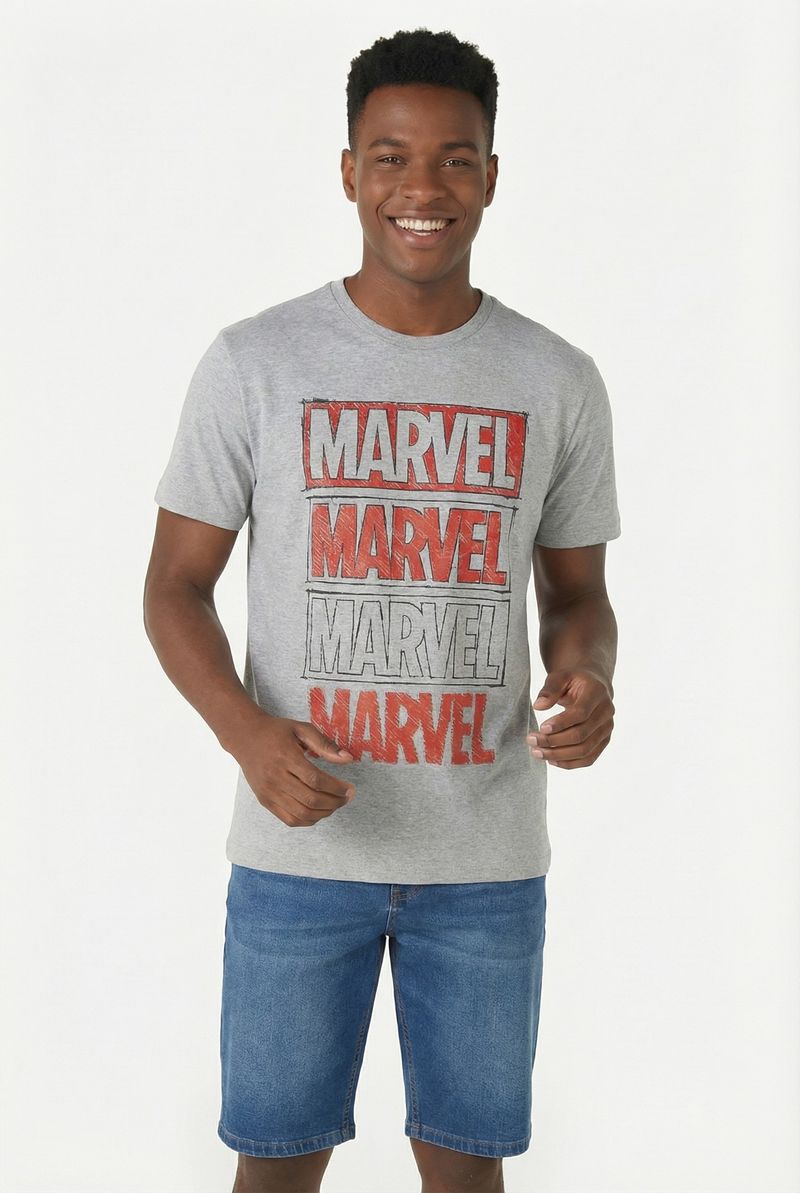 Eleve seu estilo com a Camiseta Masculina Marvel Estampa Repetida Cinza Mescla Caedu. Confeccionada em 100% algodão e meia malha, oferece conforto incomparável. A estampa exclusiva da Marvel adiciona personalidade, ideal para quem busca moda e qualidade nas roupas Caedu.