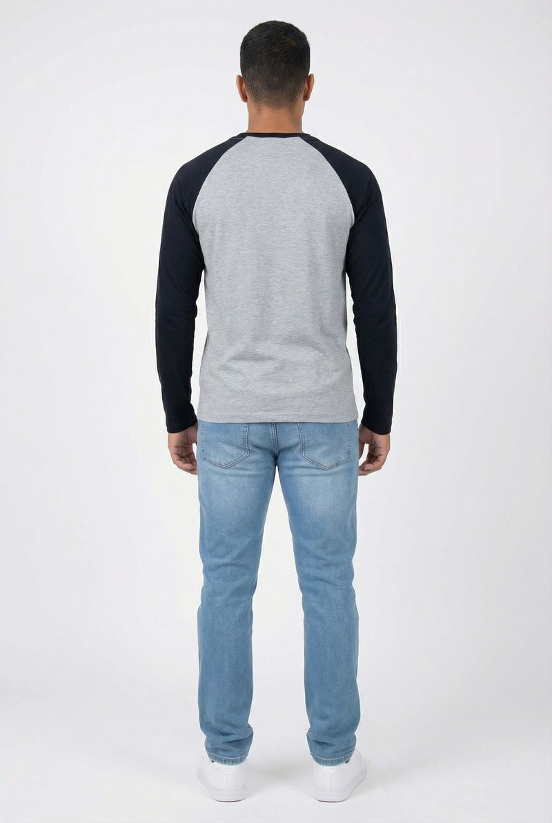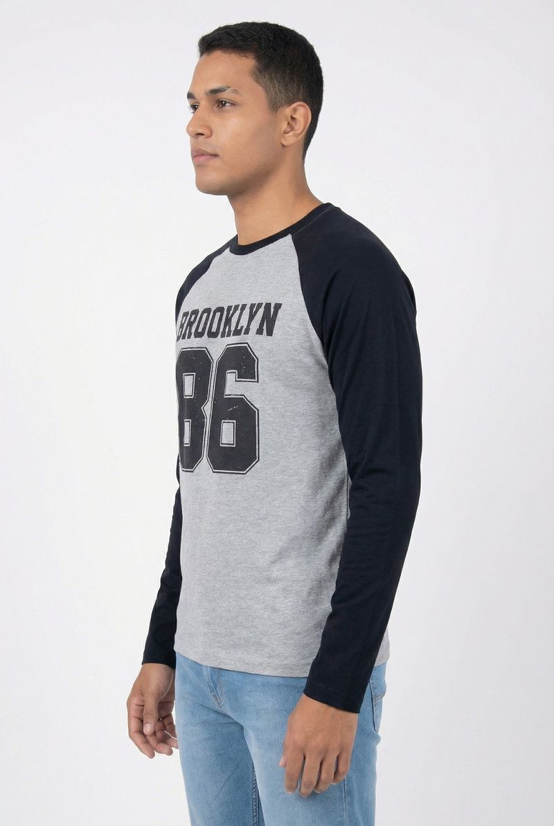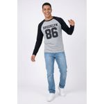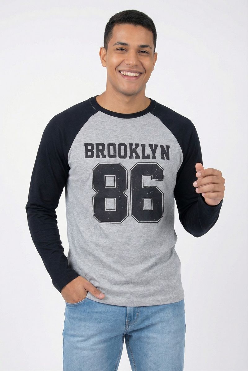 A Camiseta Masculina Manga Longa Raglan Brooklyn 86 Caedu é a escolha perfeita para quem busca conforto e estilo. Confeccionada em 100% algodão de meia malha, oferece toque macio e caimento ideal. Seu design moderno com mangas raglan e a estampa 'Brooklyn 86' em cinza mescla e preto garantem um visual autêntico para a moda masculina.
