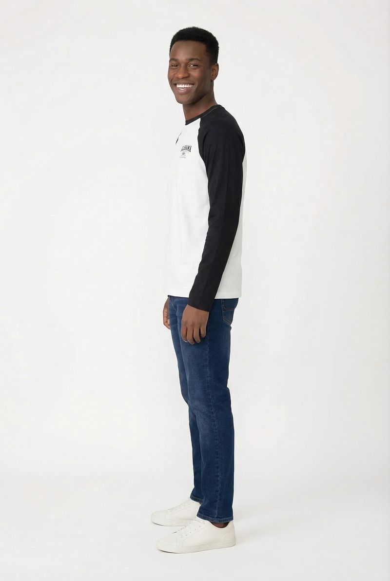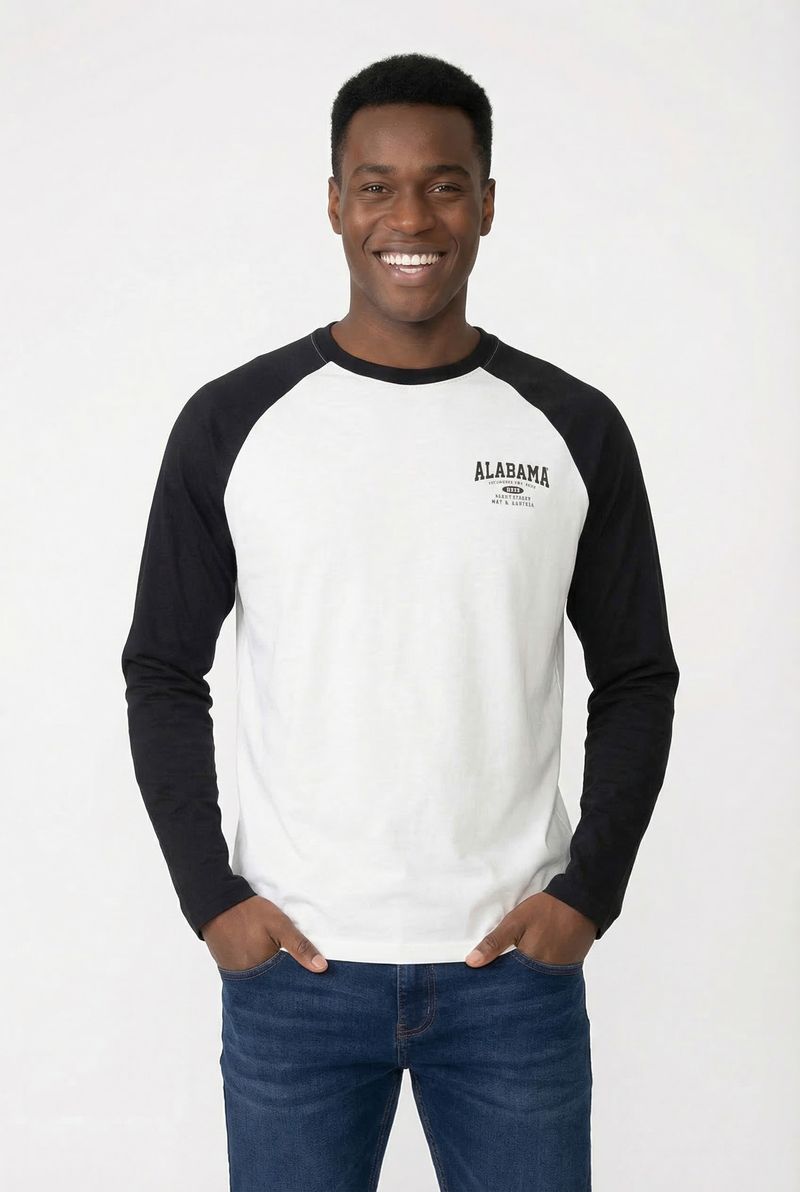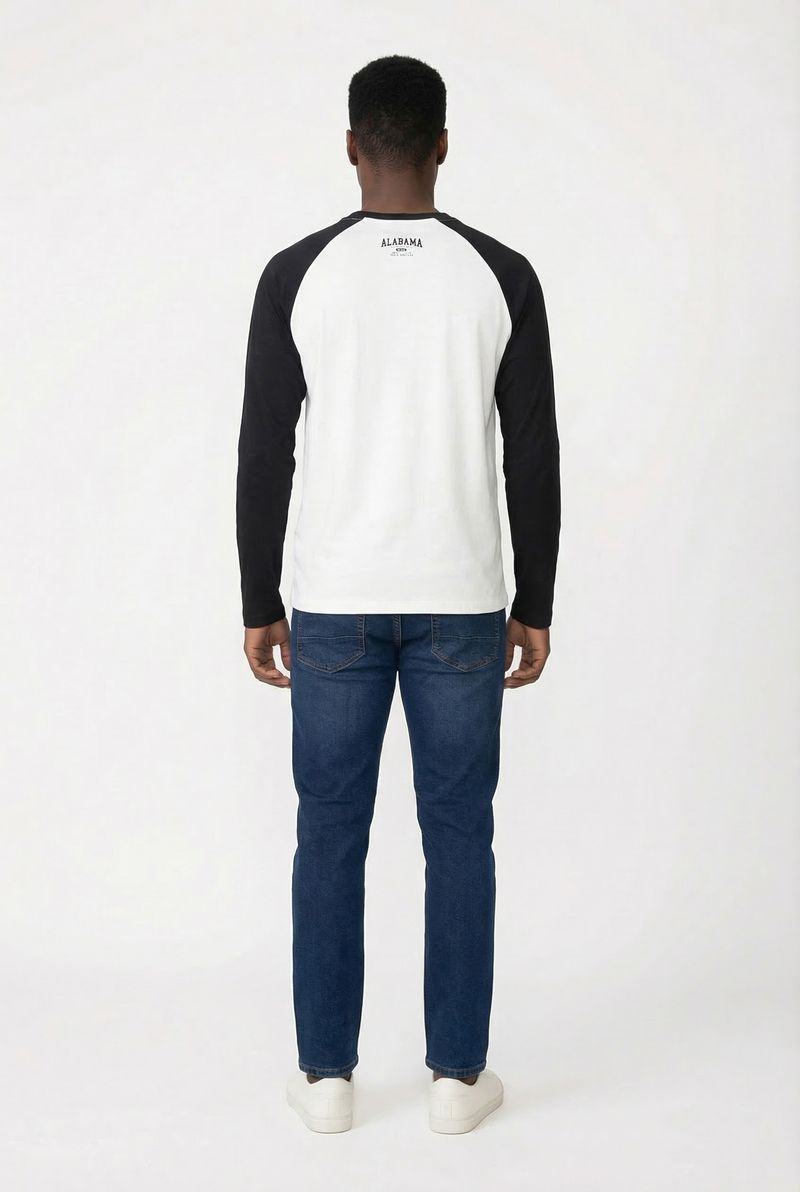 A Camiseta Masculina Raglan Manga Longa Alabama Caedu oferece o máximo de conforto e estilo para seu dia a dia. Confeccionada em 100% algodão de meia malha, possui design raglan preto e branco com estampa exclusiva. Ideal para quem busca roupas masculinas de moda casual e versátil, perfeita para compor um look moderno e despojado, disponível nas Lojas Caedu.
