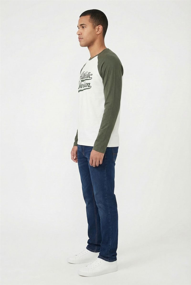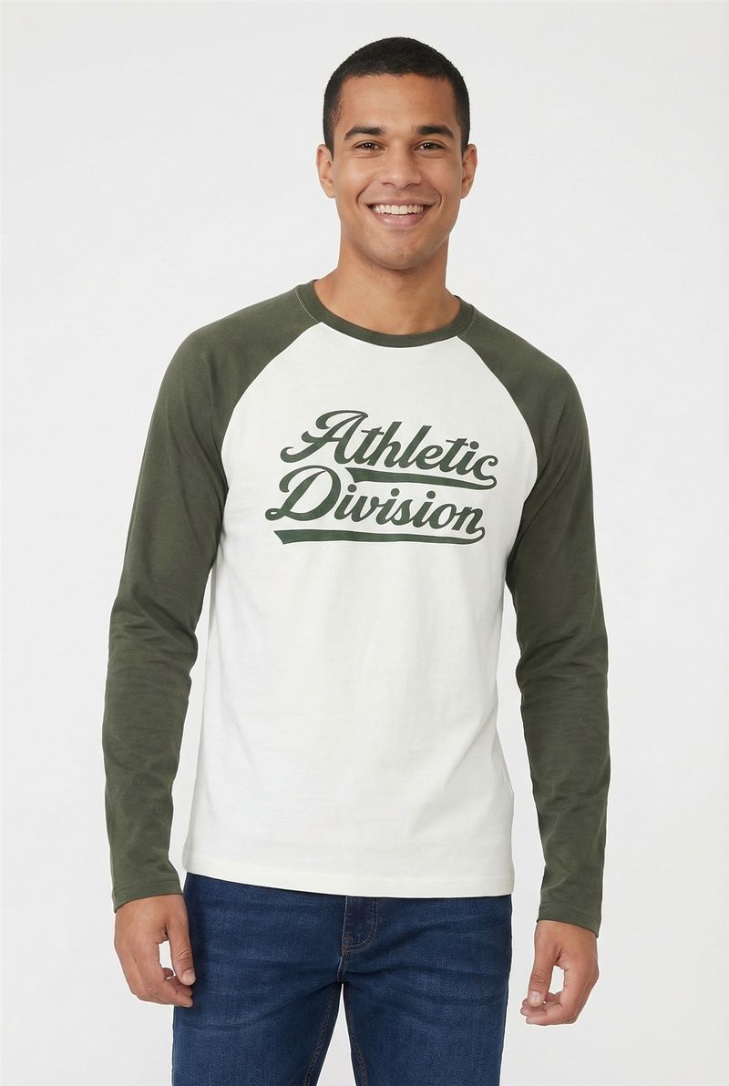 A Camiseta Masculina Raglan Manga Longa Athletic Division Caedu eleva seu estilo. Em meia malha 100% algodão, oferece conforto e durabilidade. O design raglan e o verde pistache das mangas trazem a moda, ideal para um visual moderno.