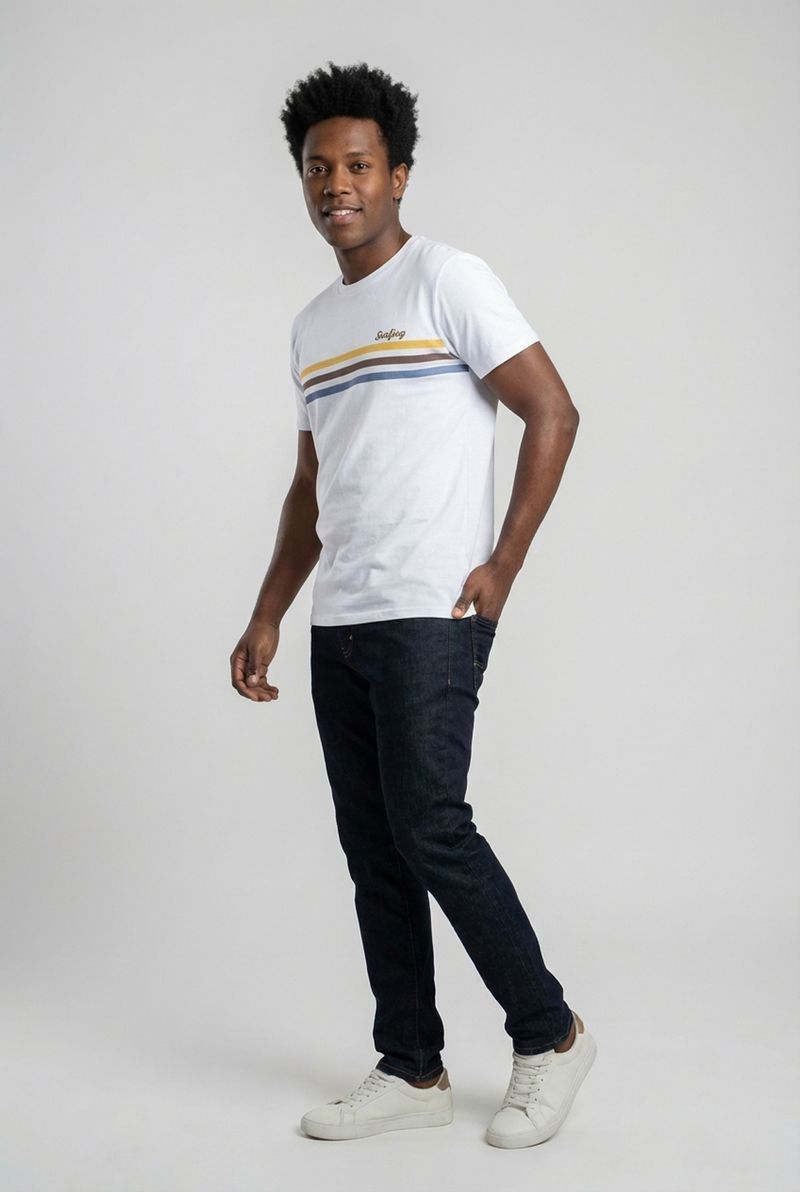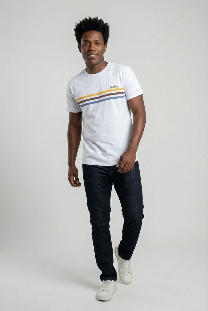 A Camiseta Masculina Caedu Branca com estampa Surfing é a escolha perfeita para quem busca estilo e conforto. Com design moderno, apresenta faixas horizontais coloridas e a palavra "Surfing" em destaque, ideal para um visual despojado e cheio de personalidade.