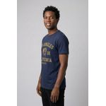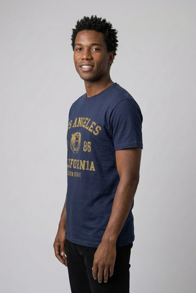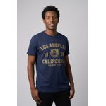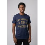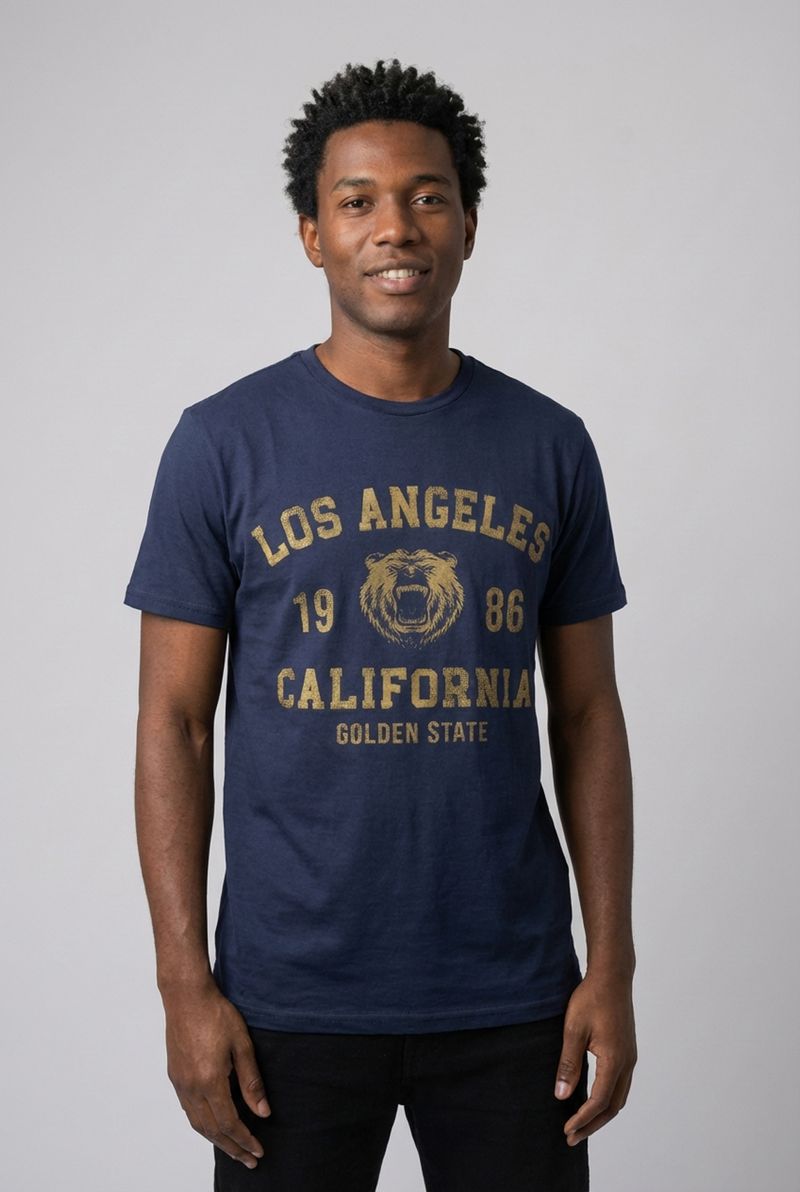 Vista a moda urbana com a Camiseta Masculina Caedu Los Angeles California Bear. Seu design exclusivo com estampa dourada de urso e detalhes vintage em azul marinho oferece estilo e conforto para o dia a dia. Perfeita para quem busca roupas autênticas e cheias de personalidade.