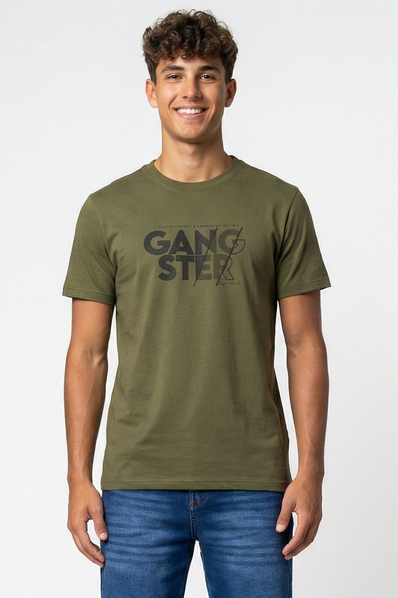 A Camiseta Masculina Streetwear Gangster Verde Militar Caedu, em 100% algodão e meia malha, garante conforto e durabilidade. Com estampa 'GANGSTER', é a roupa perfeita para expressar sua personalidade e seguir a moda urbana.