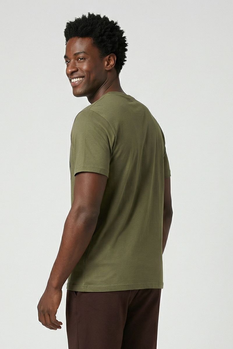 Combine sua camiseta verde oliva com jeans claros ou escuros para um look clássico. Para um estilo mais descontraído, use com bermudas de sarja e tênis. Adicione uma jaqueta jeans ou de couro para um toque extra de moda e versatilidade.