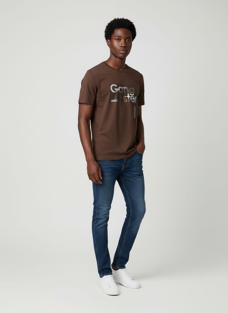 A Camiseta Masculina Street Gangster Caedu em marrom médio é a escolha perfeita para quem busca estilo urbano e conforto. Confeccionada em 100% algodão de meia malha, oferece toque macio e caimento ideal. Sua estampa "Gangster" garante um visual autêntico e moderno para suas roupas do dia a dia.
