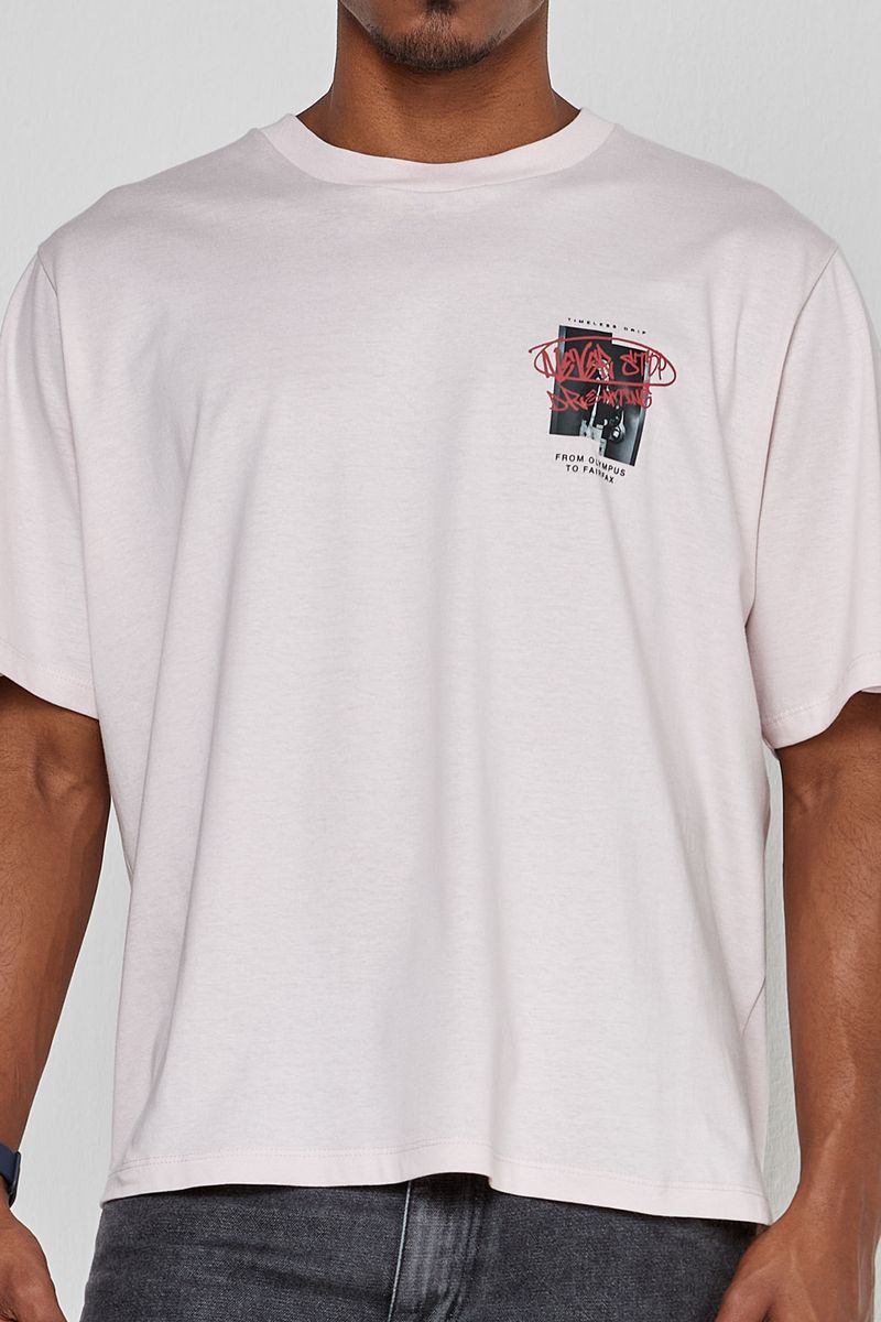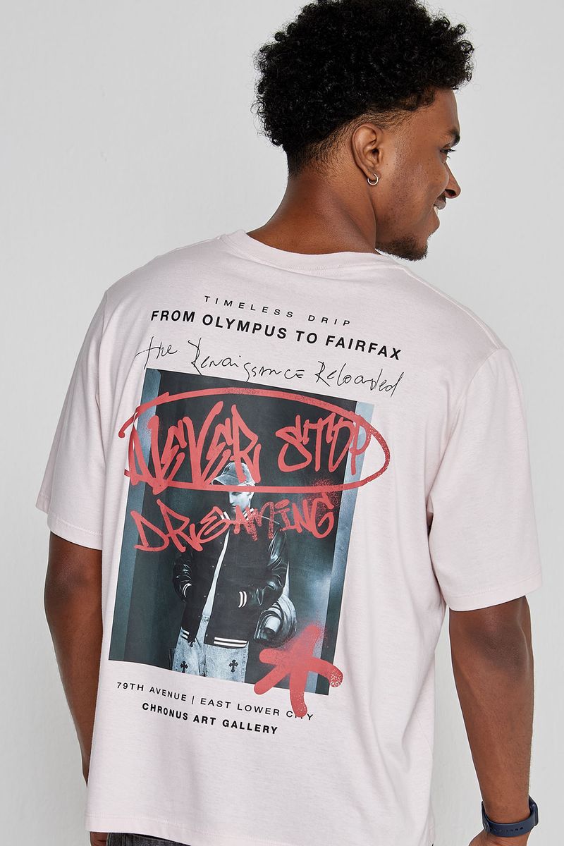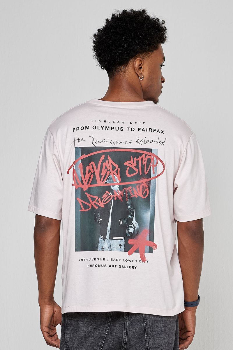 A Camiseta Masculina Oversized Streetwear Caedu, 100% algodão, oferece conforto e estilo. Estampa 'Never Stop Dreaming' em rosa claro eleva sua moda. Ideal para um visual autêntico e inspirador.