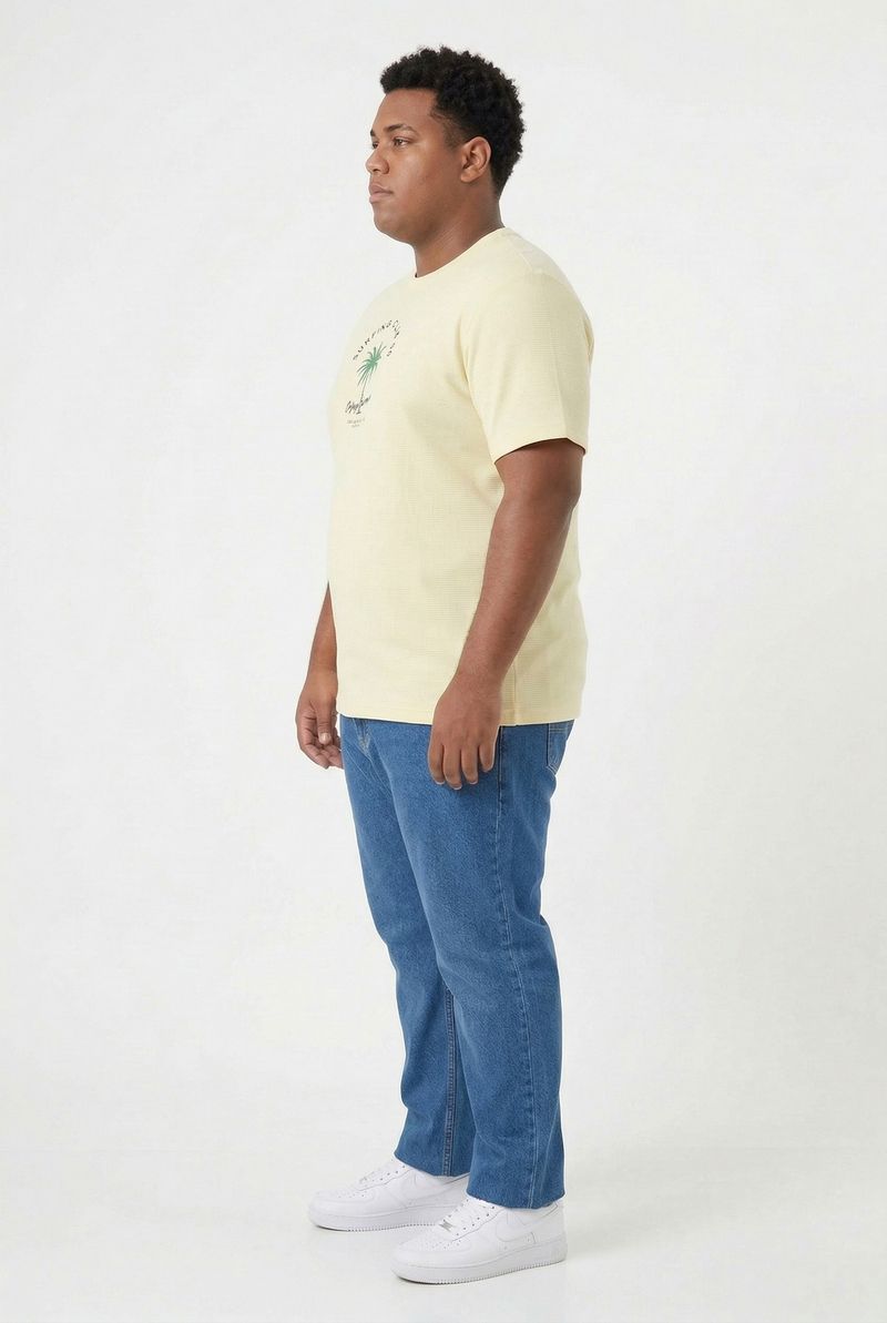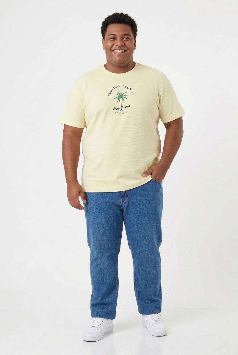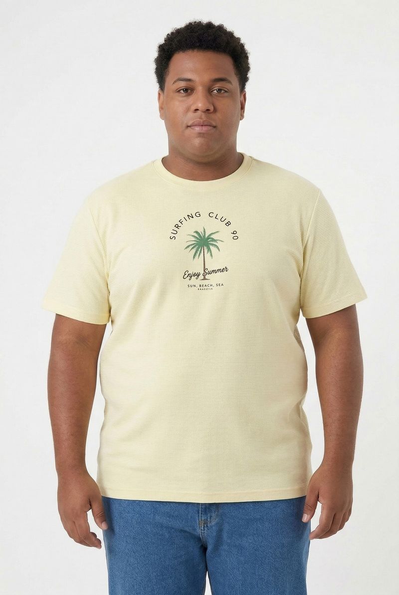 Eleve seu estilo com a Camiseta Masculina Caedu Amarelo Manteiga. Confeccionada em gorgurão 100% algodão, oferece conforto e toque macio. A estampa "Surfing Club" com palmeira traz a essência da moda casual e despojada para suas roupas.
