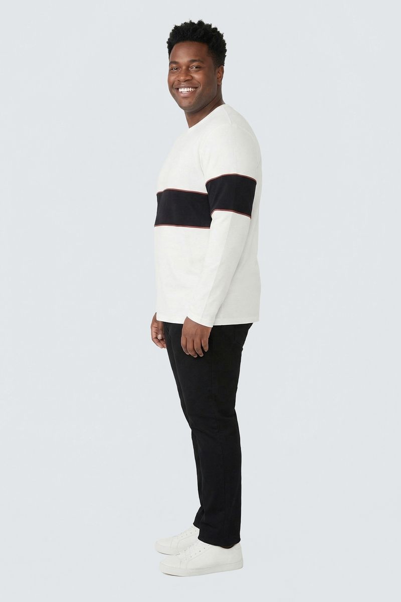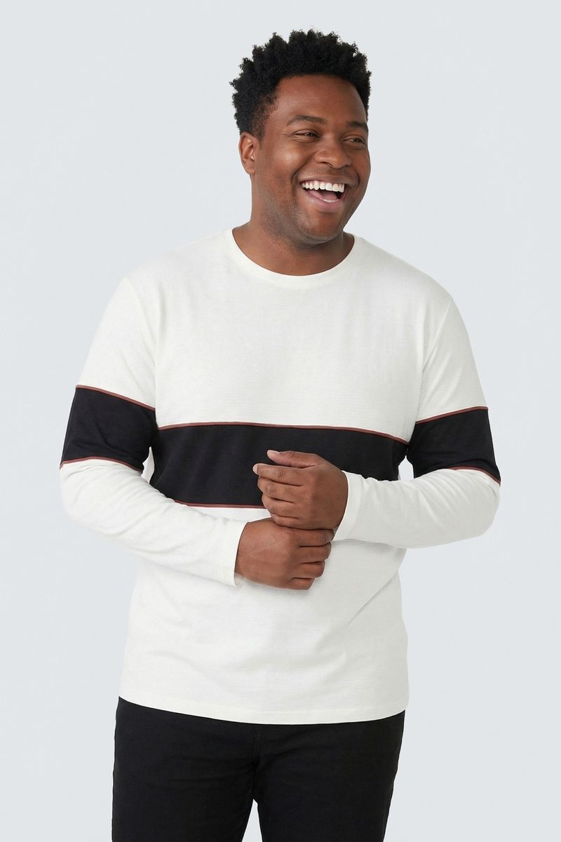 A Camiseta Masculina Manga Longa Caedu oferece conforto superior com seu tecido 100% algodão. Com design moderno, apresenta cor off white, faixa preta marcante e um sutil delineado vermelho, ideal para quem busca estilo e versatilidade na moda masculina.