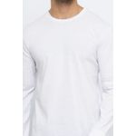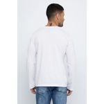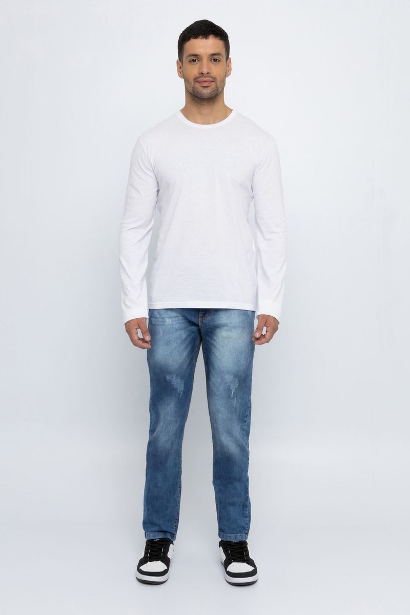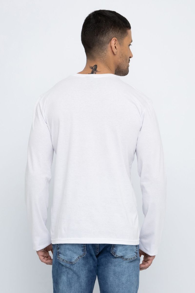 Camiseta masculina lisa, modelo casual. A peça apresenta caimento reto e solto, manga longa e gola redonda.
