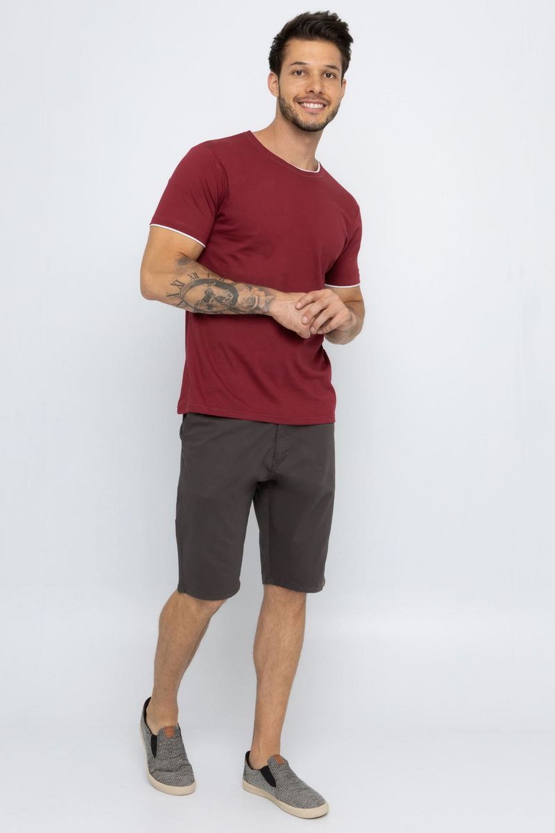 Camiseta masculina lisa, modelo casual. A peça apresenta caimento reto e solto, manga curta e gola redonda com detalhes.